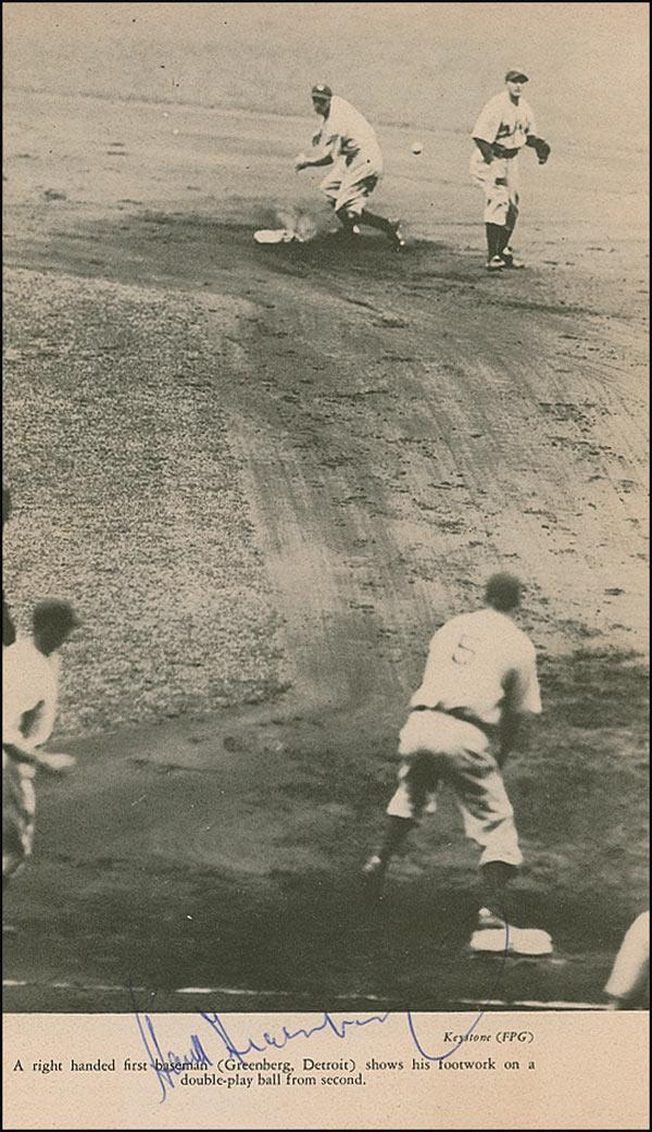Two signed clipped book photos of Greenberg on the field, one 4.25 x 3.5 and one 5 x 9, each signed in blue ballpoint. In fine condition.