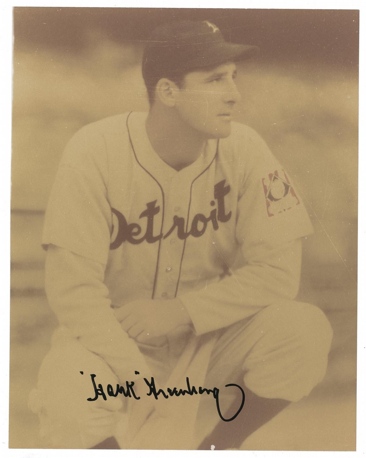 Baseball Hall of Famer who was one of the premier power hitters of his generation. Color glossy 8 x 10 photo of Greenberg in his Detroit uniform, signed in black felt tip. Mild overall toning and surface marks, all inherent to the original photo, otherwise fine condition.