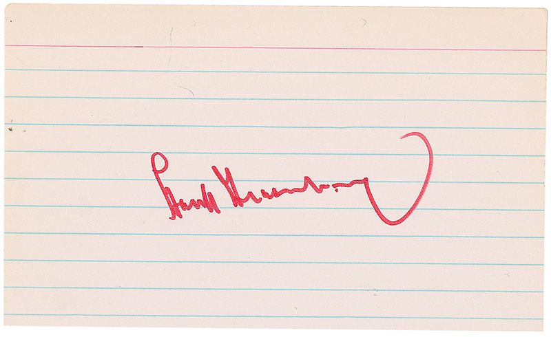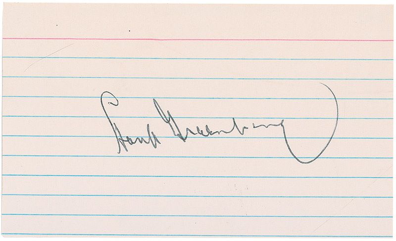 Two signatures, “Hank Greenberg,” one in red felt tip and one in black ballpoint, on individual off-white 5 x 3 lined cards. In fine condition.