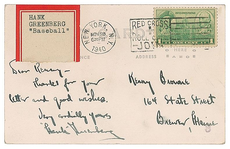 Vintage matte-finish 3.5 x 5.5 postcard photo showing Greenberg crouching with three baseball bats, signed and inscribed in fountain pen, "To Kenny—with best regards, 'Hank' Greenberg," with a handwritten note on the reverse, "Dear Kenny—Thanks for your letter and good wishes, Very cordially yours, 'Hank' Greenberg." Postmarked at New York on November 28, 1940. In fine condition, with one small crease, a light paperclip impression, and a small label affixed to the reverse.