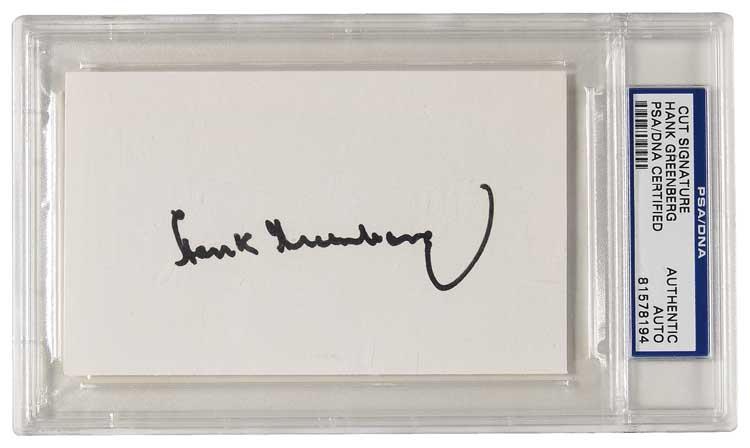 Felt tip signature, “Hank Greenberg,” on an off-white 5 x 3 card. Encapsulated in a plastic PSA/DNA authentication holder. In very fine condition. RRAuction COA.