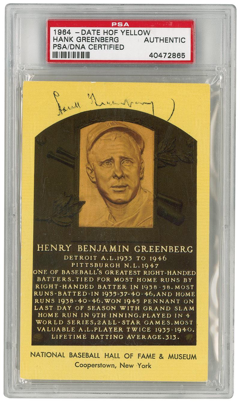 Gold Hall of Fame plaque card signed across the top in black ballpoint. Encapsulated in a plastic PSA/DNA authentication holder. In very good condition, with light overall brushing to signature. RRAuction COA.
