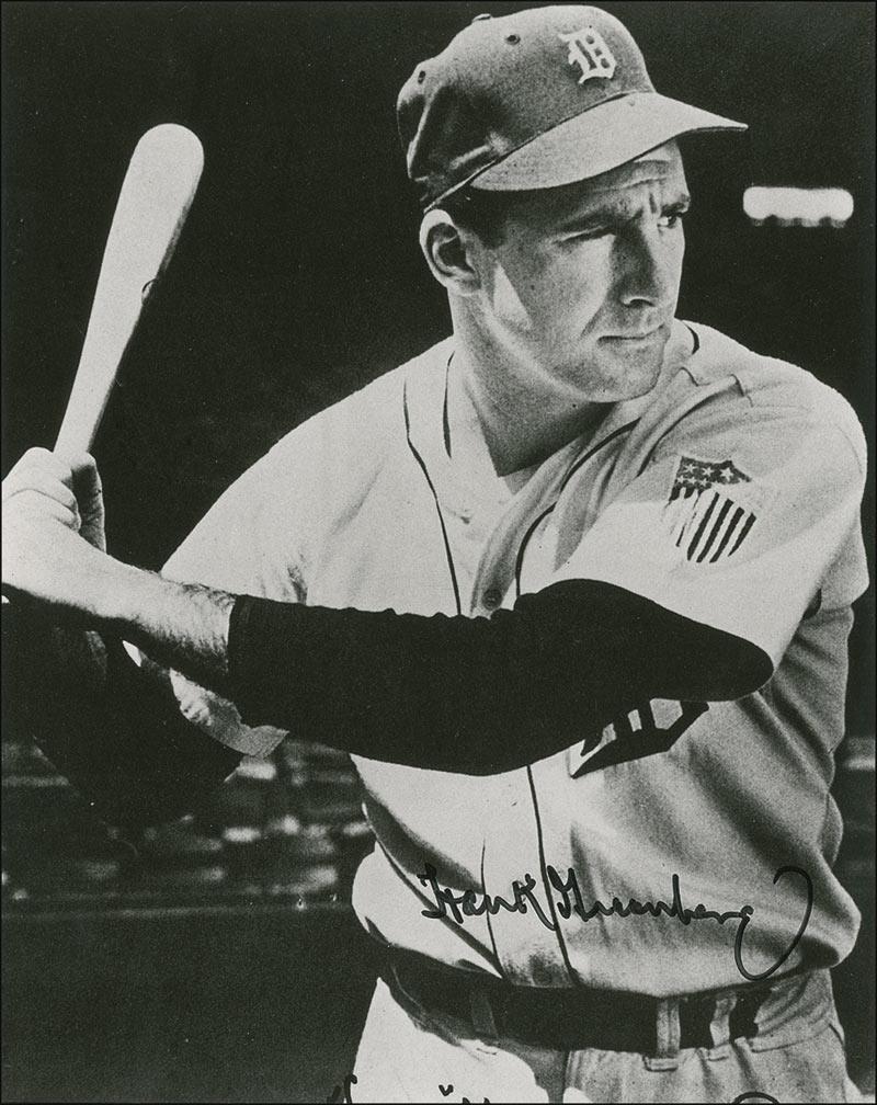 Satin-finish 8 x 10 photo of Greenberg at the plate for Detroit, signed in black felt tip. Creases to lower left of background, otherwise fine condition.