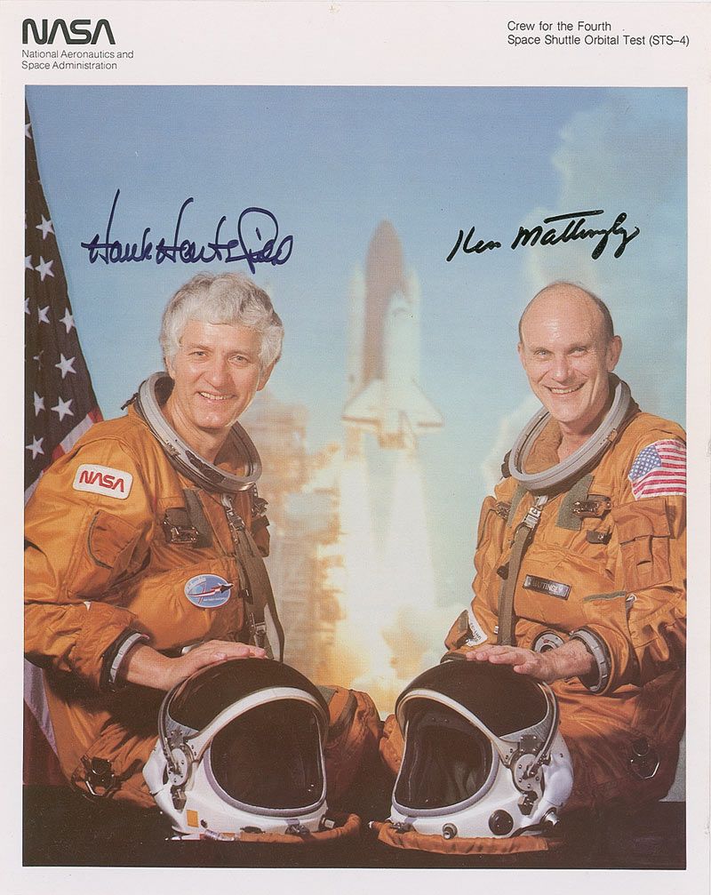 Color 8 x 10 NASA photo of the STS-4 crew, signed in black felt tip by Hank Hartsfield and Ken Mattingly. In fine condition, with a few corner tip and edge dings.