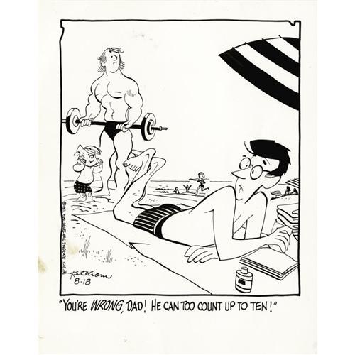 <B>Hank Ketcham - Dennis the Menace Daily Comic Strip Original Art, 8-18-71 (Publisher-Hall Syndicate, 1978).</B></I> Even relaxing at the beach, Dennis' dad can't stay out of trouble! Ketcham's sure line and expert use of solid black areas shine on this sunny example. Ink on bristol measuring 7.5" x 9.5", with an image area of 6.5" x 8". Outside of two small smudges, one just inside the image area, the piece is in Excellent condition. <BR><BR><B>Important notice:</B> Heritage usually auctions material at the rate of 200-250 lots per hour. On some occasions eBay Live bid software or the Internet may not be able to keep up with the pace of the auction. We recommend placing a realistic absentee bid now as insurance to avoid disappointment. Occasionally the auctioneer may eliminate or reject an eBay Live bid, and the auctioneer may also reopen a lot after the close of the eBay live bidding (usually because we missed an audience bid), and may reject your bid even if it shows you as the winning bidder. By bidding via eBay Live, you agree that Heritage may award the lot to another bidder at its sole discretion under the circumstances described above or any other reasonable circumstances. Since eBay bids are not shown to us until we open the lot on the floor, we treat those bids just like floor bids. In most cases the floor responds before the eBay bid is presented to us, due to Internet lag time, so for consistency we have made it a policy that floor bids are always considered first over tie eBay live bids. Also please note that all Heritage lots purchased through eBay Live carry a 22.5% Buyer's Premium. Please make sure you read the Terms and Conditions before you bid. This lot is being auctioned in conjunction with a live floor auction by Heritage Auction Galleries. All final auction and invoice information will be supplied by Heritage Auction Galleries, and all other information should be considered preliminary. Lot:41001 <BR><BR><B>Winning Notification and Billing:</B> After the FINAL session in this auction is complete, Heritage will send e-mail and snail mail invoices. This process normally takes several days. All final auction and invoice information will be supplied by Heritage Auction Galleries, and all other information should be considered preliminary. <BR><BR>This auction will be conducted on a live auction floor and over the Internet through eBay Live. If you choose to place an absentee bid, please take a moment to <font color='#0000ff'><u><a href='http://pages.ebay.com/liveauctions/help/before/laabsentee.html'>learn how eBay Live absentee bidding works</a></u></font><font color='#000000'>