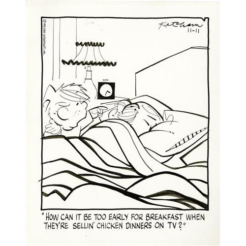 <B>Hank Ketcham - Dennis the Menace Daily Comic Strip Original Art, dated 11-11-78 (Field Enterprises, 1978).</B></I> It's never too early for Dennis to get out of bed and find out what's on TV! "Bed-head" Dennis and sleepy Alice are nicely pictured in this charming daily. Ink on bristol measuring 7.5" x 9.5", with an image area of 6.5" x 8". In Excellent condition. <BR><BR><B>Important notice:</B> Heritage usually auctions material at the rate of 200-250 lots per hour. On some occasions eBay Live bid software or the Internet may not be able to keep up with the pace of the auction. We recommend placing a realistic absentee bid now as insurance to avoid disappointment. Occasionally the auctioneer may eliminate or reject an eBay Live bid, and the auctioneer may also reopen a lot after the close of the eBay live bidding (usually because we missed an audience bid), and may reject your bid even if it shows you as the winning bidder. By bidding via eBay Live, you agree that Heritage may award the lot to another bidder at its sole discretion under the circumstances described above or any other reasonable circumstances. Since eBay bids are not shown to us until we open the lot on the floor, we treat those bids just like floor bids. In most cases the floor responds before the eBay bid is presented to us, due to Internet lag time, so for consistency we have made it a policy that floor bids are always considered first over tie eBay live bids. Also please note that all Heritage lots purchased through eBay Live carry a 22.5% Buyer's Premium. Please make sure you read the Terms and Conditions before you bid. This lot is being auctioned in conjunction with a live floor auction by Heritage Auction Galleries. All final auction and invoice information will be supplied by Heritage Auction Galleries, and all other information should be considered preliminary. Lot:41001 <BR><BR><B>Winning Notification and Billing:</B> After the FINAL session in this auction is complete, Heritage will send e-mail and snail mail invoices. This process normally takes several days. All final auction and invoice information will be supplied by Heritage Auction Galleries, and all other information should be considered preliminary. <BR><BR>This auction will be conducted on a live auction floor and over the Internet through eBay Live. If you choose to place an absentee bid, please take a moment to <font color='#0000ff'><u><a href='http://pages.ebay.com/liveauctions/help/before/laabsentee.html'>learn how eBay Live absentee bidding works</a></u></font><font color='#000000'>
