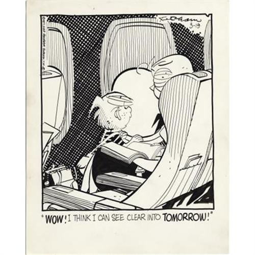 <B>Hank Ketcham - Dennis the Menace Daily Comic Strip Original Art, dated 3-19-77 (Field Newspaper Syndicate, 1977).</B></I> Dennis the Menace on an airplane -- could travel get any more fun? The image area of this daily measures 6.5" x 8", and its condition is Excellent. <BR><BR><b>Shipping:</b> Flat Material, Small (<a target="_blank" href="http://www.heritageauctions.com/common/shipping.php">view shipping information</a>)