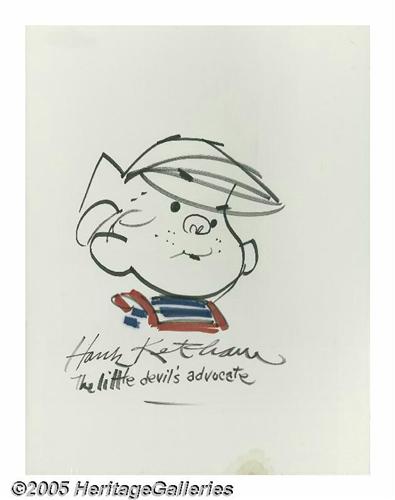 <B>Hank Ketcham - Dennis the Menace Sketch Original Art (undated).</B></I> Dennis the Menace, the little devil's advocate, in a rare moment, pauses in this mischevious sketch, done in black, red, and blue marker. Overall size is 18" x 24". There is one small stain at the extreme lower right edge, otherwise the art is in Excellent condition.