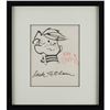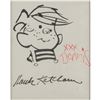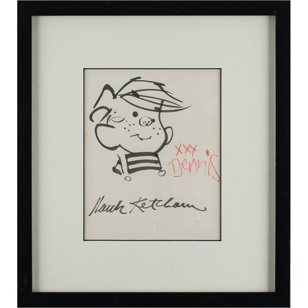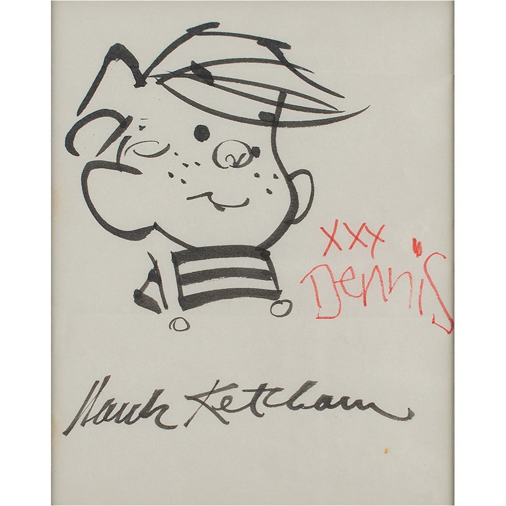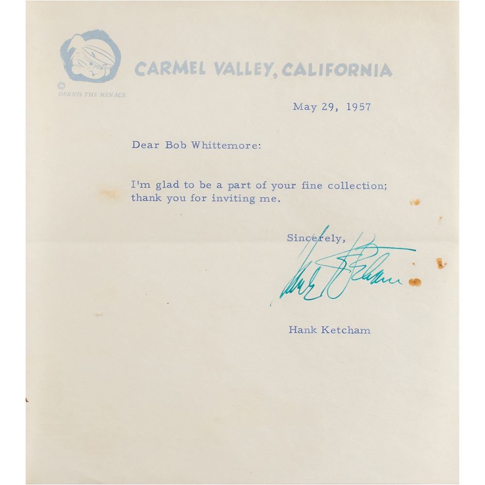 Two items: an original Hank Ketcham sketch of Dennis the Menace, accomplished in black ink on an off-white 5 x 6.25 sheet, signed below by Ketcham, who adds "xxx, Dennis," in red ink on behalf of the character; and a brief TLS, one page, 6.25 x 7, Dennis the Menace letterhead, May 29, 1957, addressed to Bob Whittemore: "I'm glad to be a part of your fine collection; thank you for inviting me." The sketch is matted and framed to an overall size of 9.75 x 11. In overall fine condition, with two horizontal folds to sketch, and some stains to the letter.