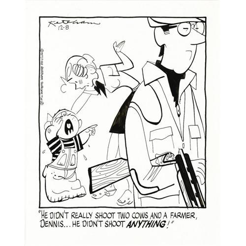 <B>Hank Ketcham Studio - Dennis The Menace Daily Comic Strip Original Art, dated 12-8-77 (Field Newspaper Syndicate, 1977).</B></I> Dennis is an emotional advocate for gun control, in this lively <I>Dennis the Menace</B></I> daily. The image area measures approximately 6.5" x 8" and the condition is Excellent. <BR><BR><B>Important notice:</B> Heritage usually auctions material at the rate of 200-250 lots per hour. On some occasions eBay Live bid software or the Internet may not be able to keep up with the pace of the auction. We recommend placing a realistic absentee bid now as insurance to avoid disappointment. Occasionally the auctioneer may eliminate or reject an eBay Live bid, and the auctioneer may also reopen a lot after the close of the eBay live bidding (usually because we missed an audience bid), and may reject your bid even if it shows you as the winning bidder. By bidding via eBay Live, you agree that Heritage may award the lot to another bidder at its sole discretion under the circumstances described above or any other reasonable circumstances. Since eBay bids are not shown to us until we open the lot on the floor, we treat those bids just like floor bids. In most cases the floor responds before the eBay bid is presented to us, due to Internet lag time, so for consistency we have made it a policy that floor bids are always considered first over tie eBay live bids. Also please note that all Heritage lots purchased through eBay Live carry a 22.5% Buyer's Premium. Please make sure you read the Terms and Conditions before you bid. This lot is being auctioned in conjunction with a live floor auction by Heritage Auction Galleries. All final auction and invoice information will be supplied by Heritage Auction Galleries, and all other information should be considered preliminary. Lot:41001 <BR><BR><B>Winning Notification and Billing:</B> After the FINAL session in this auction is complete, Heritage will send e-mail and snail mail invoices. This process normally takes several days. All final auction and invoice information will be supplied by Heritage Auction Galleries, and all other information should be considered preliminary. <BR><BR>This auction will be conducted on a live auction floor and over the Internet through eBay Live. If you choose to place an absentee bid, please take a moment to <font color='#0000ff'><u><a href='http://pages.ebay.com/liveauctions/help/before/laabsentee.html'>learn how eBay Live absentee bidding works</a></u></font><font color='#000000'>