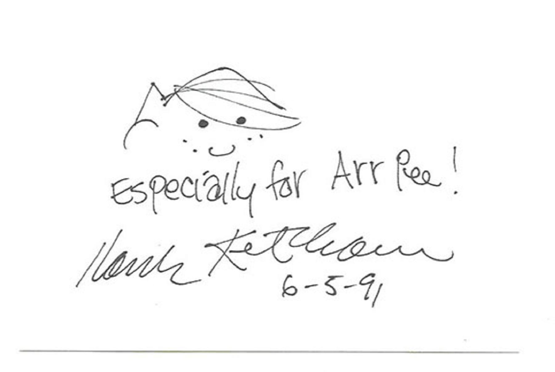 Hand drawn sketch of Dennis the Menace inscribed and signed in full and dated 6-5-91 on a 3â€x5â€card. In very fine condition