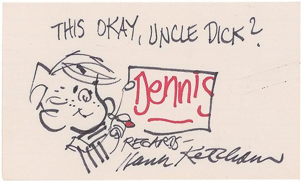 Two items: Original signed and inscribed felt tip sketch of Dennis the Menace on an off-white 5 x 3 card, “This okay, Uncle Dick? Regards-Hank Ketcham.” Signed comic book: Dennis the Menace-All Year ‘Round. No. 49, Fall, 1967. Signed on cover page in blue felt tip. Light paperclip impression to card, wear and scattered creasing to cover and spine, and uniform toning throughout, otherwise fine condition.