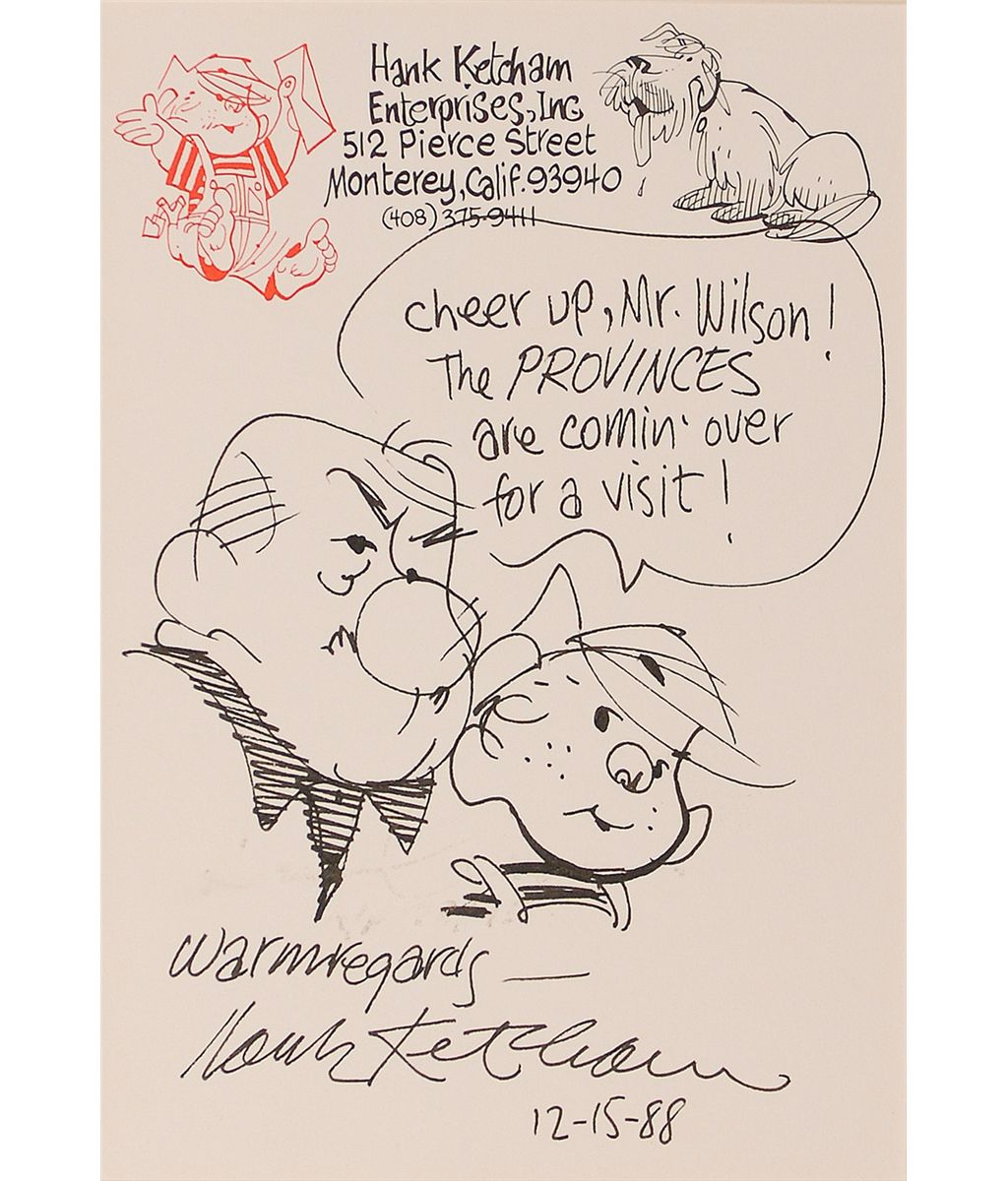 Original ink sketch of Dennis the Menace saying, “Cheer up, Mr. Wilson! The Provinces are comin’ over for a visit!,” to Mr. Wilson, on an off-white 5.5 x 8 sheet of Ketcham’s stationery, signed in black ink, “Warm regards—Hank Ketcham, 12-15-88.” Matted to an overall size of 11 x 13.5. In fine condition.