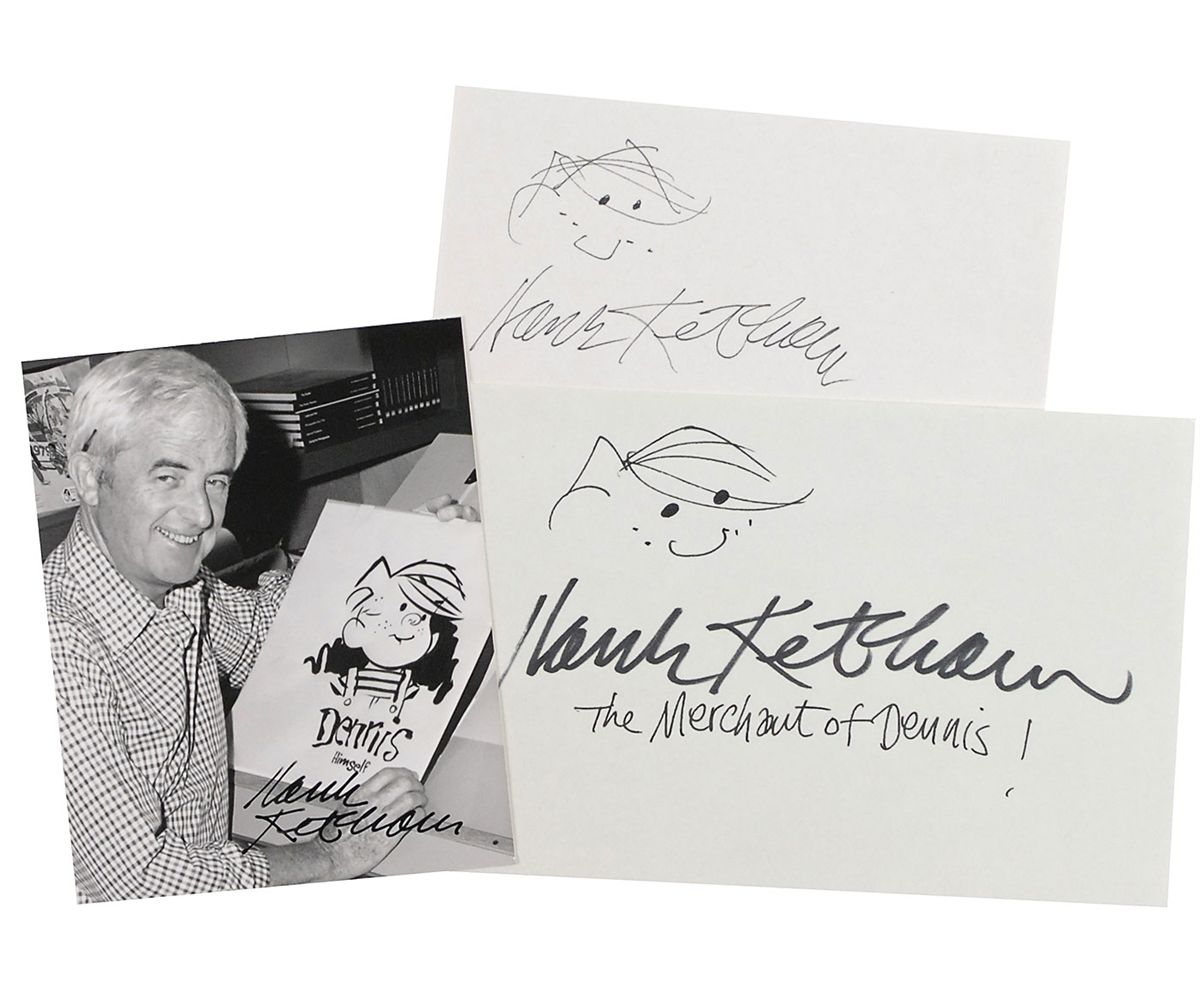 Three items: two original signed felt tip sketches of Dennis the Menace on individual off-white 5 x 3 and 6 x 4 cards; and a glossy 3.5 x 4.5 photo of Ketcham in his studio, signed in black ink. In overall fine condition.