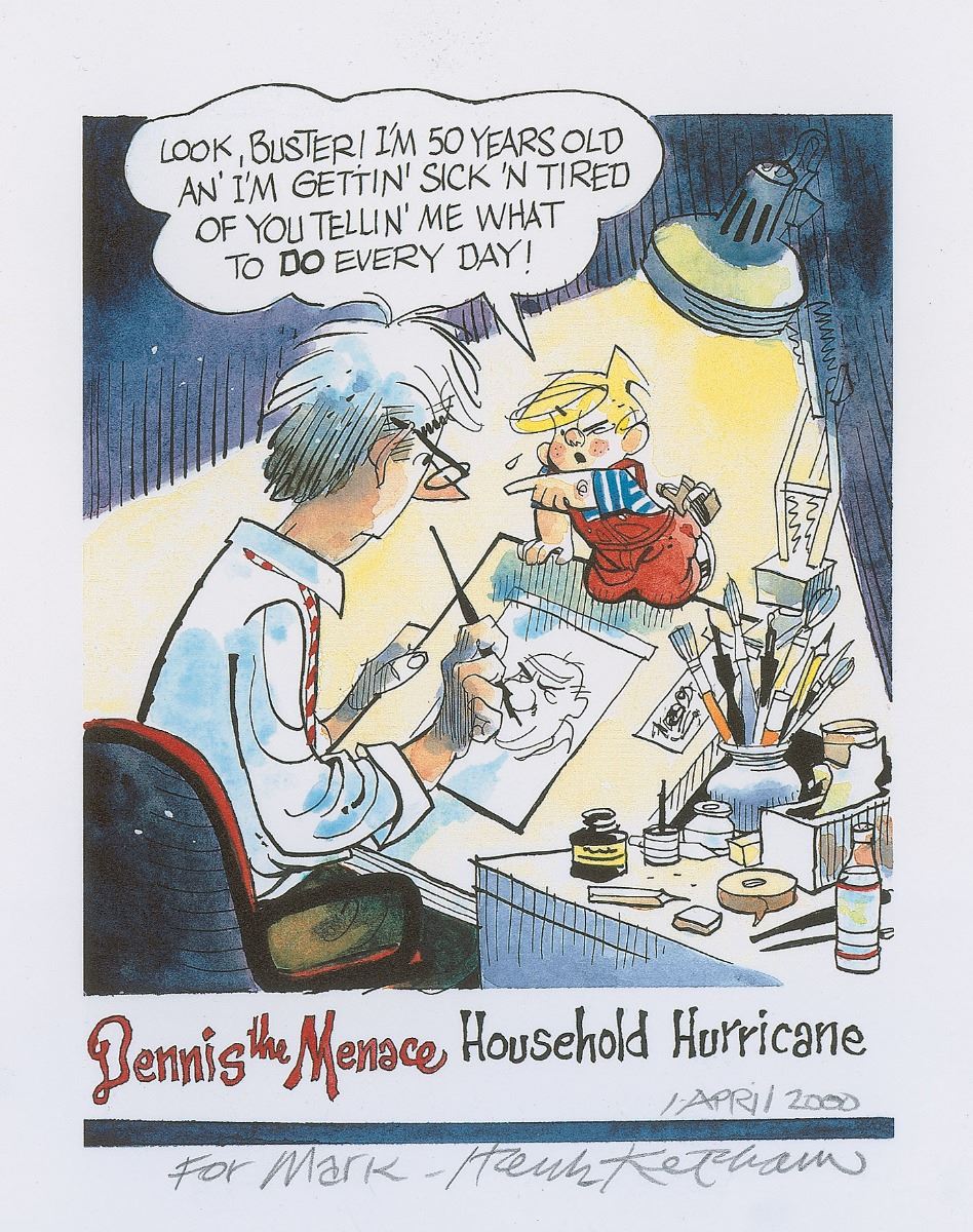 Vivid color print of Dennis the Menace on a white 8 x 10 heavyweight sheet, signed and inscribed at the bottom in pencil, “1 April 2000, For Mark—Hank Ketcham.” The cartoon shows Dennis the Menace pointing at Ketcham at work and exclaiming, “Look, Buster! I’m 50 years old an’ I’m gettin’ sick ’n tired of you tellin’ me what to do every day!” In very fine condition.