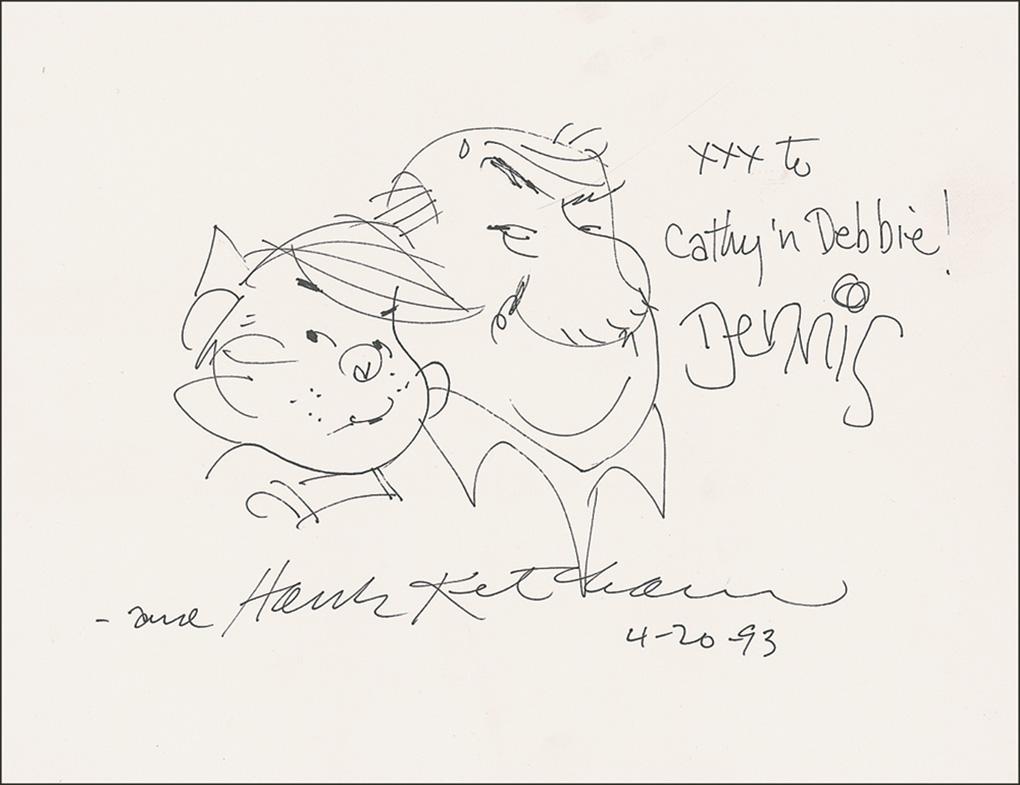 Original signed and inscribed felt tip sketch of Dennis the Menace and Mr. Wilson on an off-white 11 x 8.5 sheet, signed and inscribed “xxx to Cathy n’ Debbie! Dennis and Hank Ketcham 4-20-93.” In very fine condition.