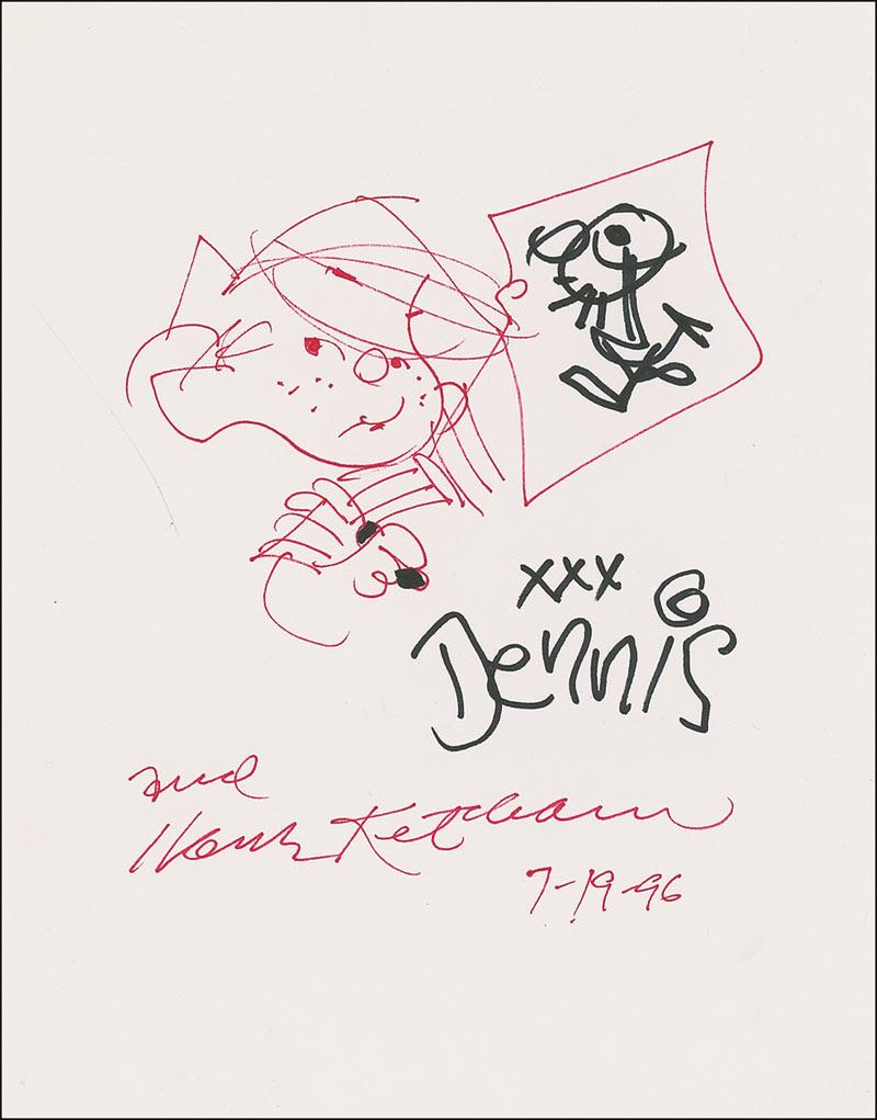 Two original felt tip sketches, one of Dennis the Menace and one of Margaret, on individual off-white sheets, both approximately 8 x 10. In fine condition. RRAuction COA.
