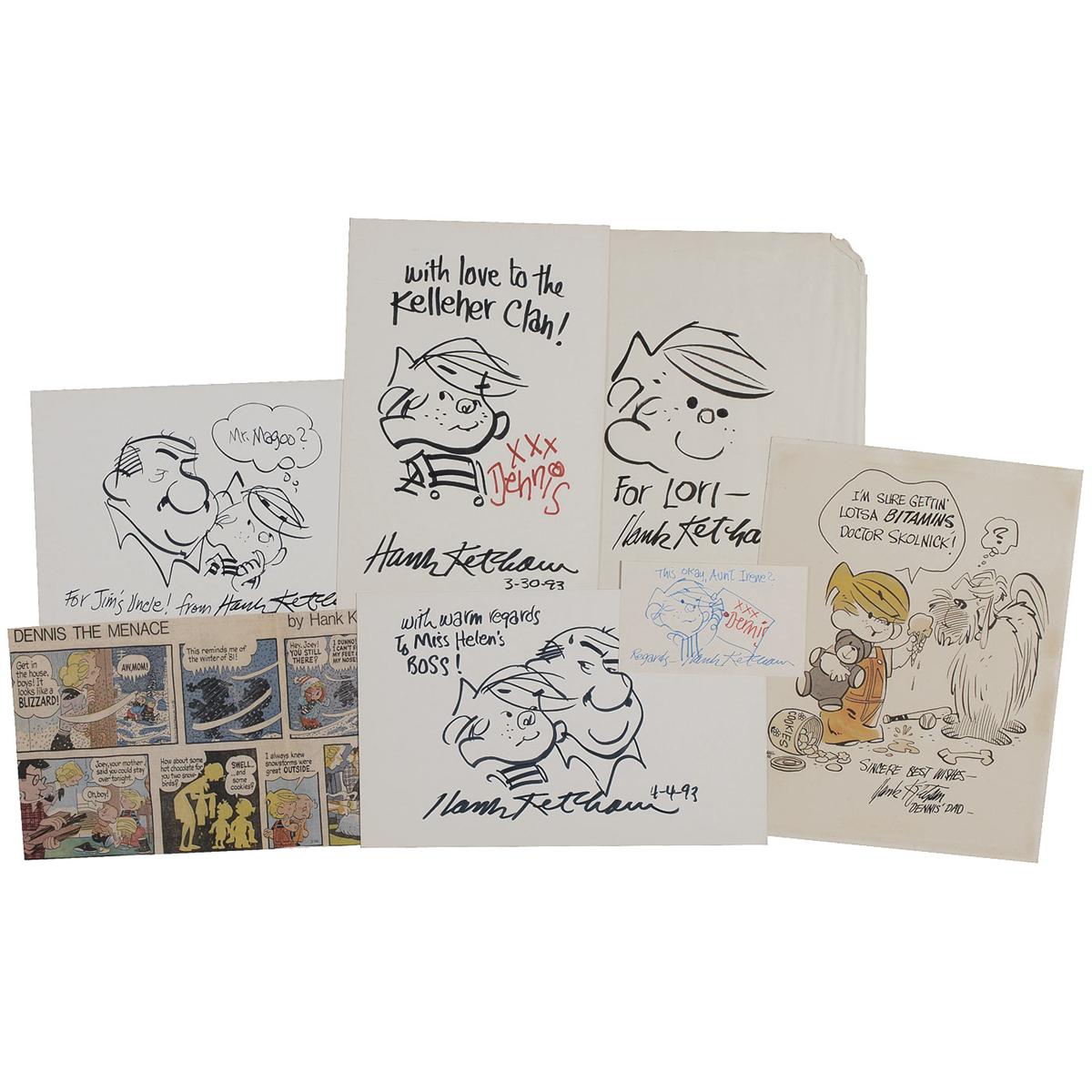 Six original felt tip sketches on individual off-white cards ranging in size from 5 x 3 to 8.5 x 11, each inscribed to a different person. Dennis the Menace is featured in each drawing, with two also featuring Mr. Wilson and one picturing Ruff. In overall fine condition.