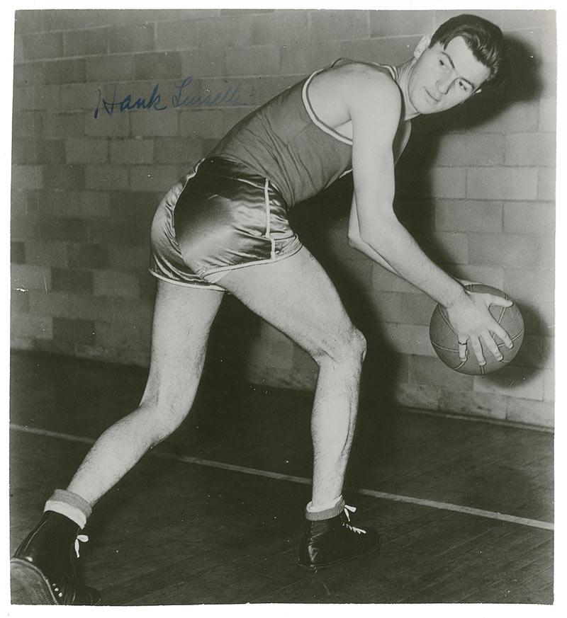Basketball player who developed the running one-handed shot. Vintage glossy 7.5 x 8 photo of Luisetti on the court, signed in fountain pen. Trimmed edges, and some scattered light surface marks and creases, otherwise fine condition.
