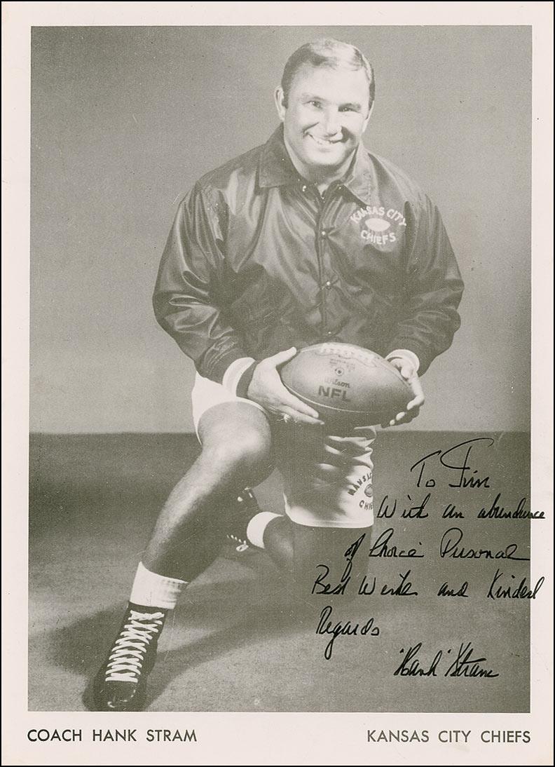 Cardstock 7.25 x 10 Kansas City Chiefs publicity photo, signed and inscribed in black ink “To Jim, With an abundance of choice personal best wishes and kindest regards, ‘Hank’ Stram.” In fine condition, a few light edge creases.