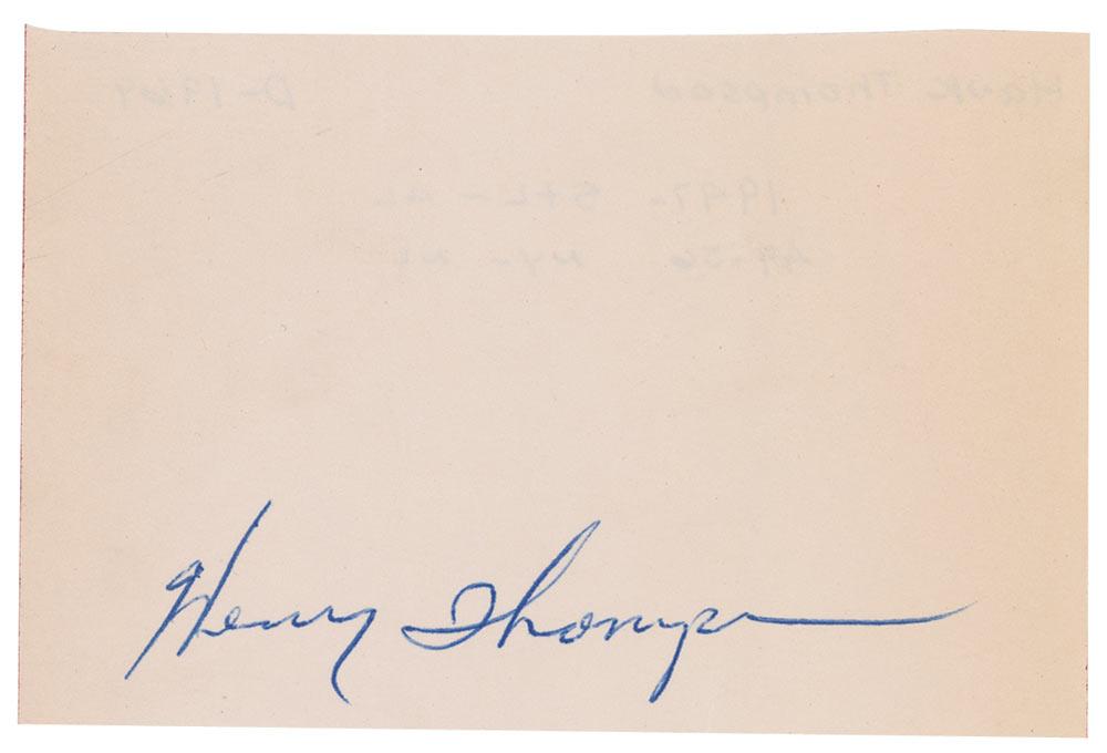 Former Major League third basemen (1925–1969) and the first African-American to play in both the National and American Leagues. Ballpoint signature, “Henry Thompson,” on an off-white 4.25 x 3 slip affixed to a white 5 x 3 card. In fine condition.