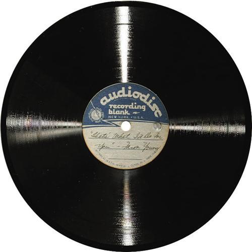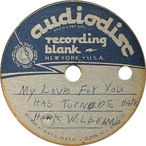 <B>Hank Williams Acetate (Audiodisc, 1950s).</B></I> This unusual acetate is an 8" disc that plays at 78 rpm, and contains four selections. Only two of those are noted on the label: Hank Williams' "My Love For You has Turned To Hate" and Faron Young's "That's What I'd Do For You." After the Williams' song is a second track, Lefty Frizzell's "Before I Leave You." A second, unidentified track also follows the Faron Young song. The big deal, of course, is Hank's tune. Condition: Hank's track: VG-EX 6; others: VG 5.<I>From the Robert Johnson Memorabilia Collection.</B></I><BR><BR><b>Shipping:</b> Recordings (<a target="_blank" href="http://www.heritageauctions.com/common/shipping.php">view shipping information</a>)