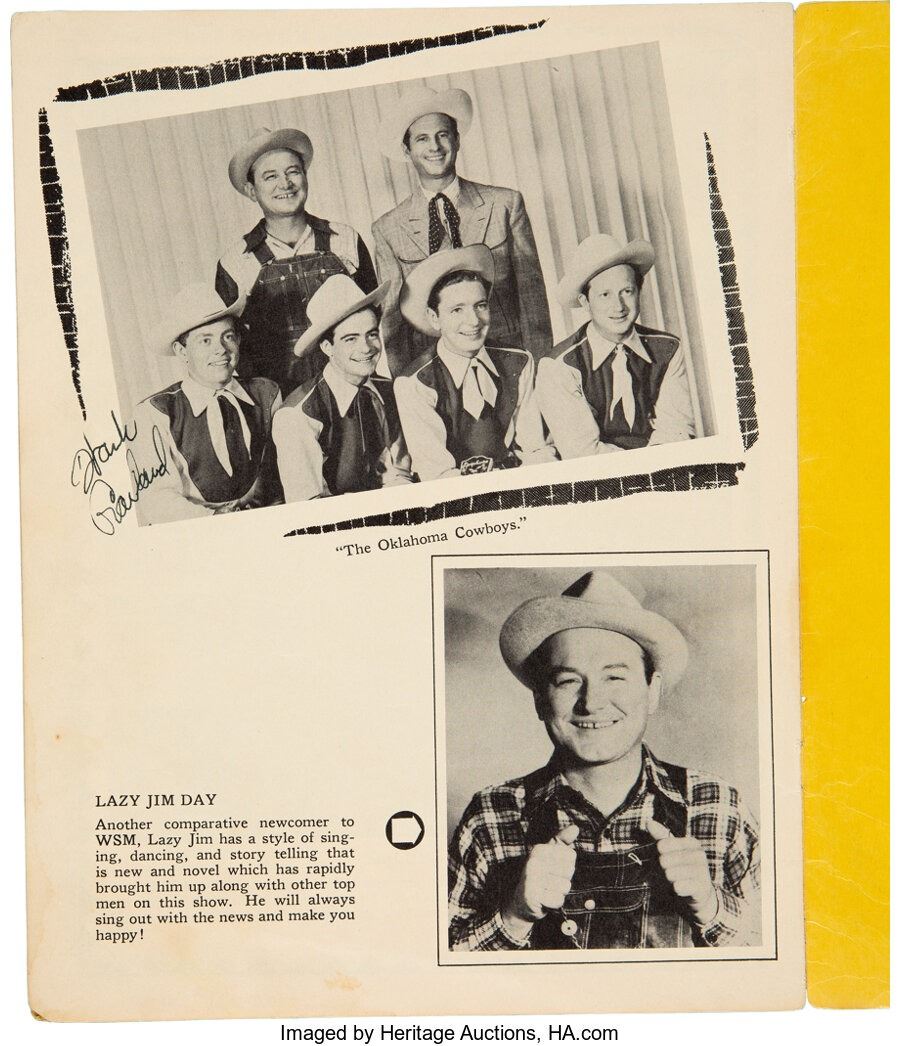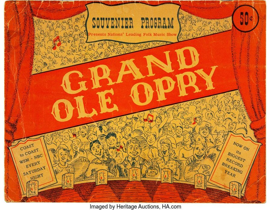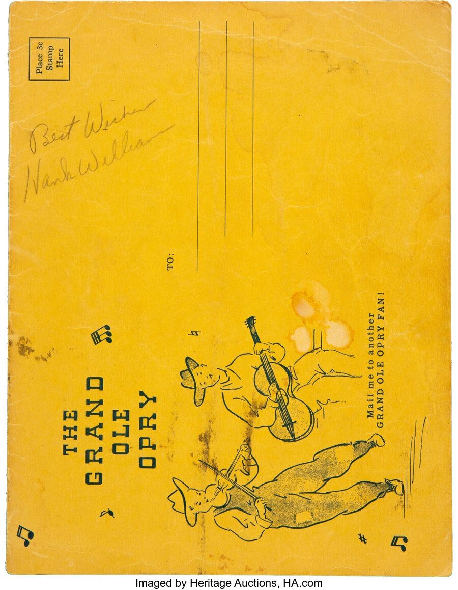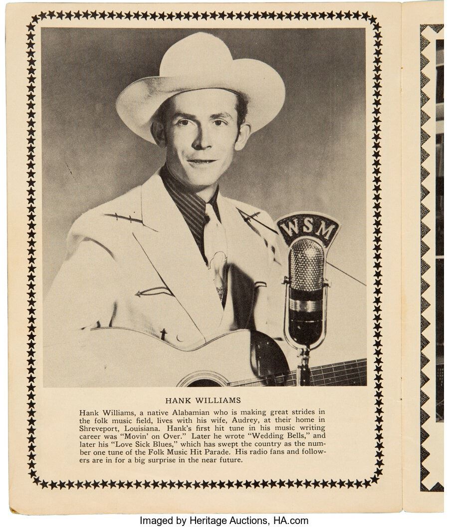 Hank Williams 1940's Autographed Grand Ole Opry Concert Program.An original 12-page souvenir concert program for the Grand Ole Opry featuring a number of CW stars, most notably the master himself, Hank Williams, with the huge bonus of Hank's autograph appearing on the back cover. Measures 8 1/2" x 11" and grades to Very Good Minus condition. COA from Heritage Auctions.