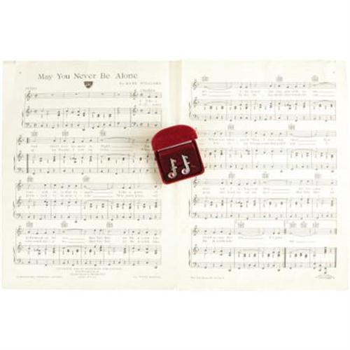 <B>Hank Williams Cufflinks and Sheet Music.</B></I> A pair of 14k white gold cufflinks with red rhinestones, owned and worn by the Country Music icon for about one year, then given to one of his favorite fans, who had admired the set on her hero. The cufflinks are in Very Fine to Excellent condition with very mild wear and tarnishing, and are accompanied by a rare copy of the published sheet music for Williams' "May You Never Be Alone" (in Fine to Very Fine condition with some creasing and wear).<BR><BR><b>Shipping:</b> Miscellaneous Collectibles, Smal (<a target="_blank" href="http://www.heritageauctions.com/common/shipping.php">view shipping information</a>)