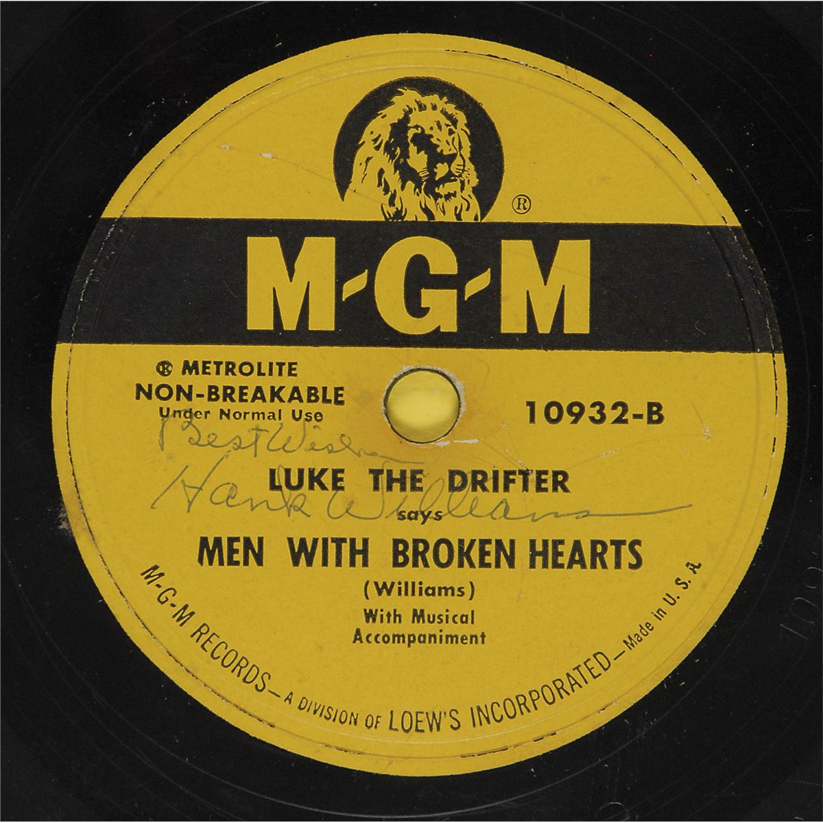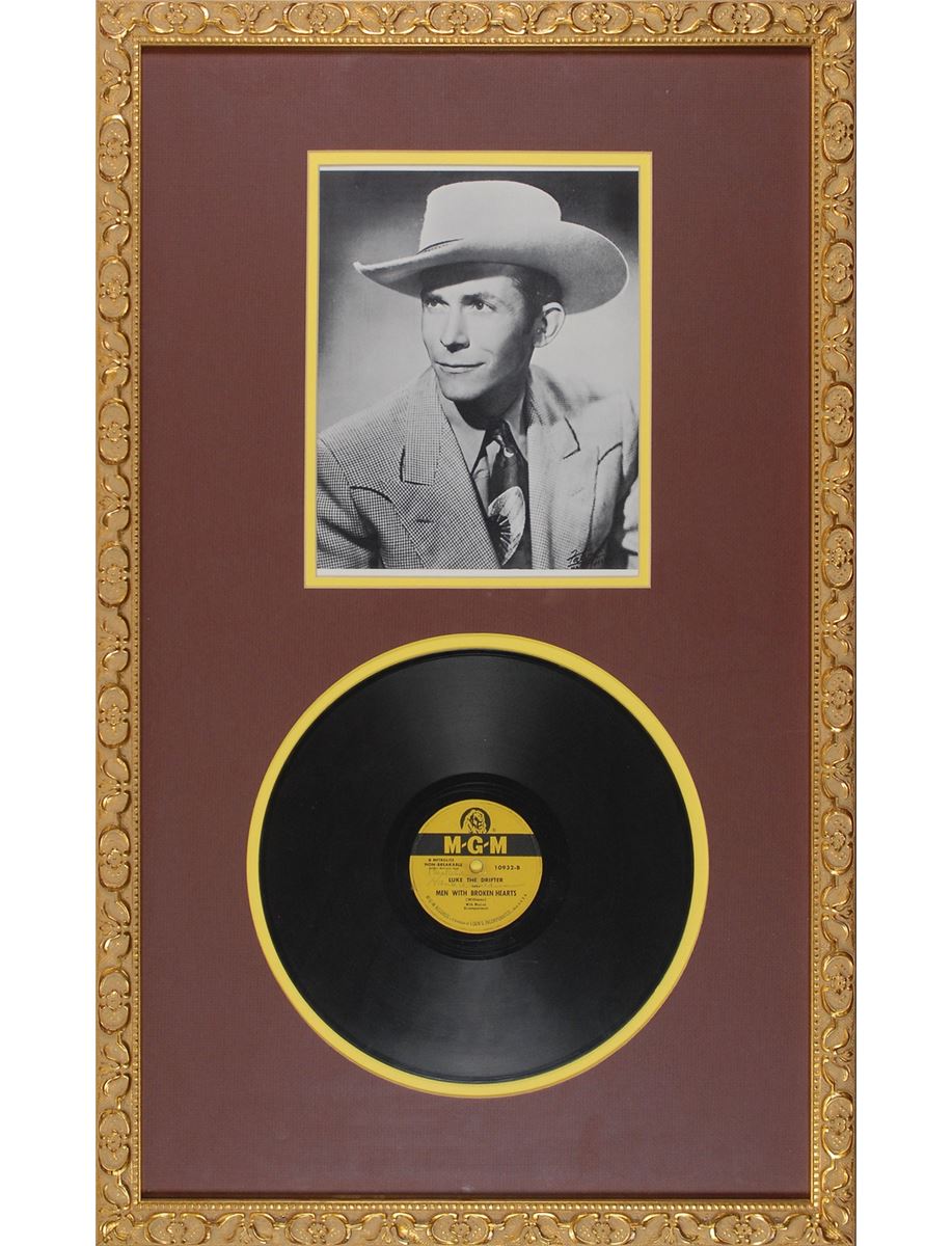 American singer-songwriter (1923–1953) known for his tremendous influence on country and folk music. Scarce 78 rpm MGM record for ‘Men with Broken Hearts,’ signed on the label in ink, “Best wishes, Hank Williams.” Attractively double-matted and framed with a portrait of Williams to an overall size of 17 x 28. In fine condition, with a few scratches to the record and label and the signature a shade light. This record was released in 1951 under the pseudonym Luke the Drifter, which Williams began using the previous year for his religious recordings. These songs were characterized by an unusual narrative vocal style rather than singing, and Williams had adopted the alias so as not to hurt the marketability of his name. Although ‘Luke the Drifter’ was supposed to be anonymous, Williams often performed some of the material. A highly desirable, scarce format from the country-western legend. Accompanied by a full letter of authenticity from PSA/DNA and a full letter of authenticity from Roger Epperson/REAL. The James Collings Collection.