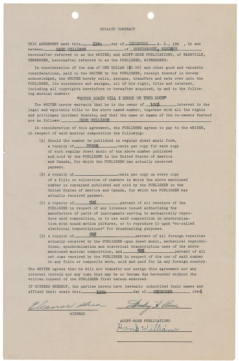 Legendary and highly influential country and western singer and songwriter (1923–1953). DS, signed “Hank Williams,” one page, 8.5 x 13, December 11, 1946. Fabulous royalty contract between the singer and Acuff-Rose Publication for the song ‘Never Again Will I Knock on Your Door.’ In part: “The writer hereby warrants that he is the owner of 100% interest in the legal and equitable title to the above named number…In consideration of this agreement, the Publisher agrees to pay to the Writer, in respect of said musical composition the following: Should the number be published in regular sheet music form, a royalty of Three centers per copy for each copy of such regular sheet music…A royalty of 50% percent of all receipts of the Publisher in respect of any licenses issued authorizing the manufacture of parts of instruments serving to mechanically reproduce said composition…A royalty of 50% percent of all foreign royalties…and 50% percent of all net sums received by the Publisher in respect of the use of said number in any folio or composition work.” In fine condition, with light creasing and wrinkling, uniform toning, and two file punch holes at the top border. Excellent association between country music’s greatest songwriter and one of his best known titles.