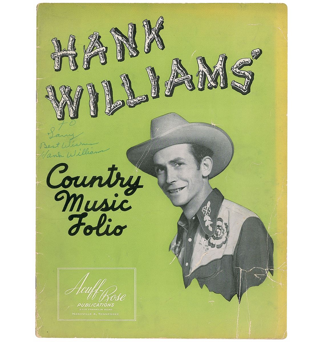 Vintage Hank Williams Country Music Folio program, 9 x 12, 48 pages, signed and inscribed in blue ink on the front cover, “To Larry, Best wishes, Hank Williams.” In very good condition, with scattered creases and a repaired tear to front cover, light handling wear, and scattered soiling to back cover.