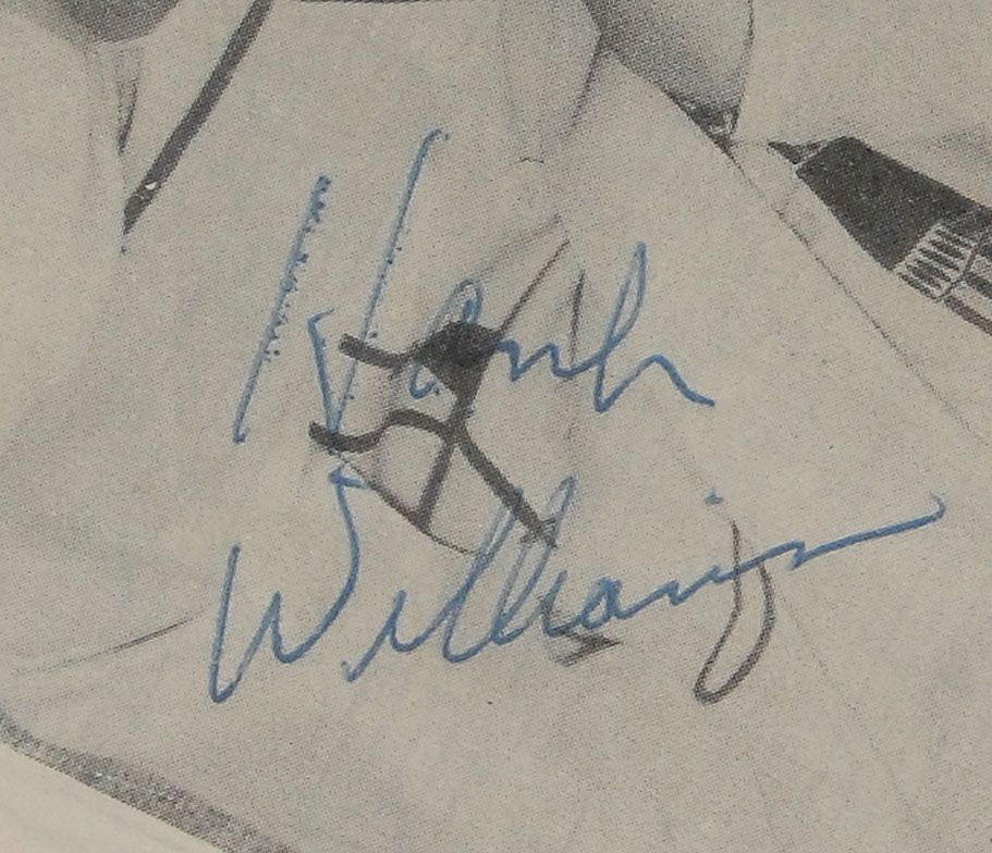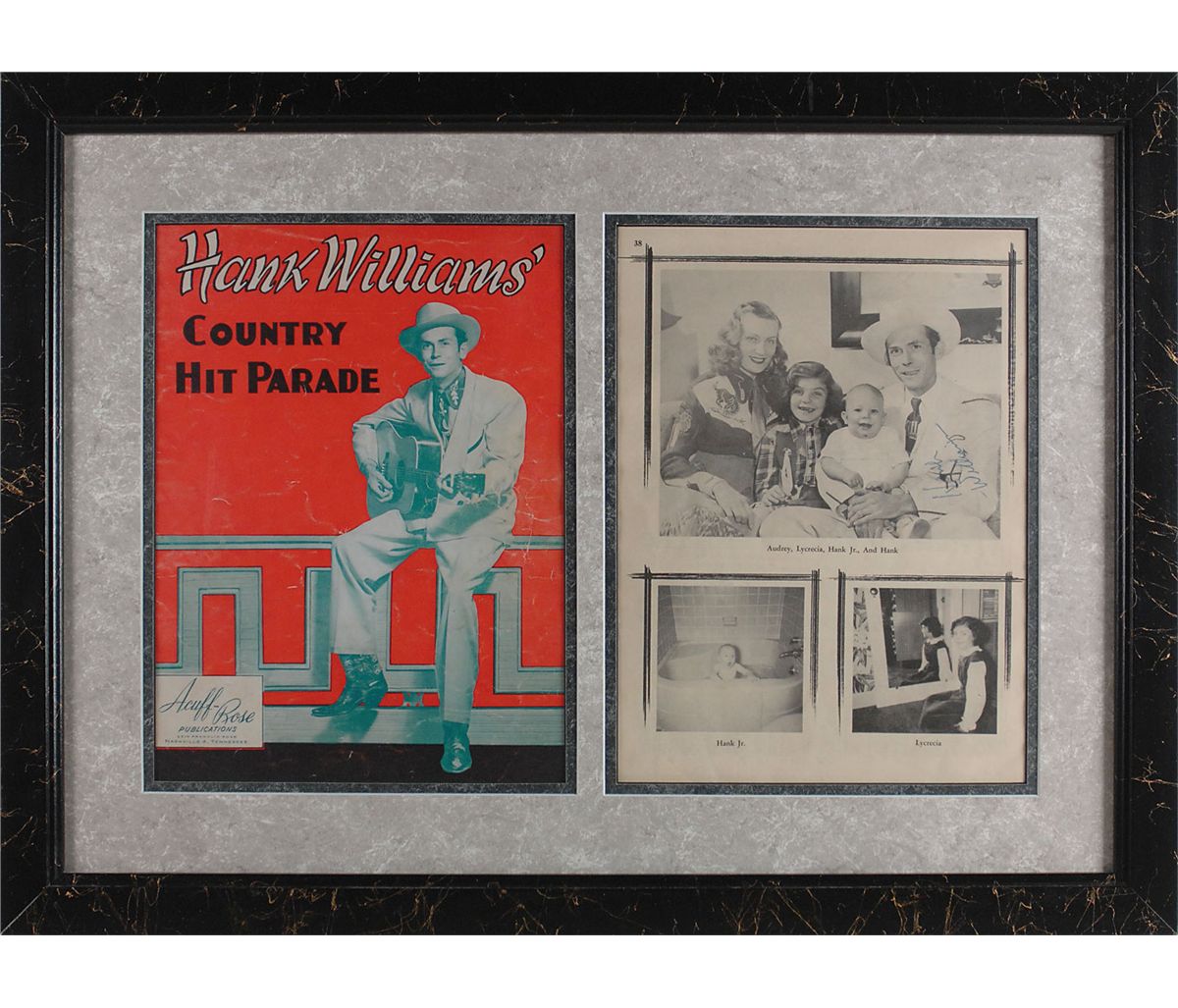 Composite photo page from Hank Williams’ Country Hit Parade songbook, 8.25 x 11.25, featuring an image of Williams, his wife, and their two children, signed vertically in blue ink. Double-matted and framed to an overall size of 24 x 17. In fine condition. Accompanied by a full letter of authenticity from Roger Epperson/REAL.