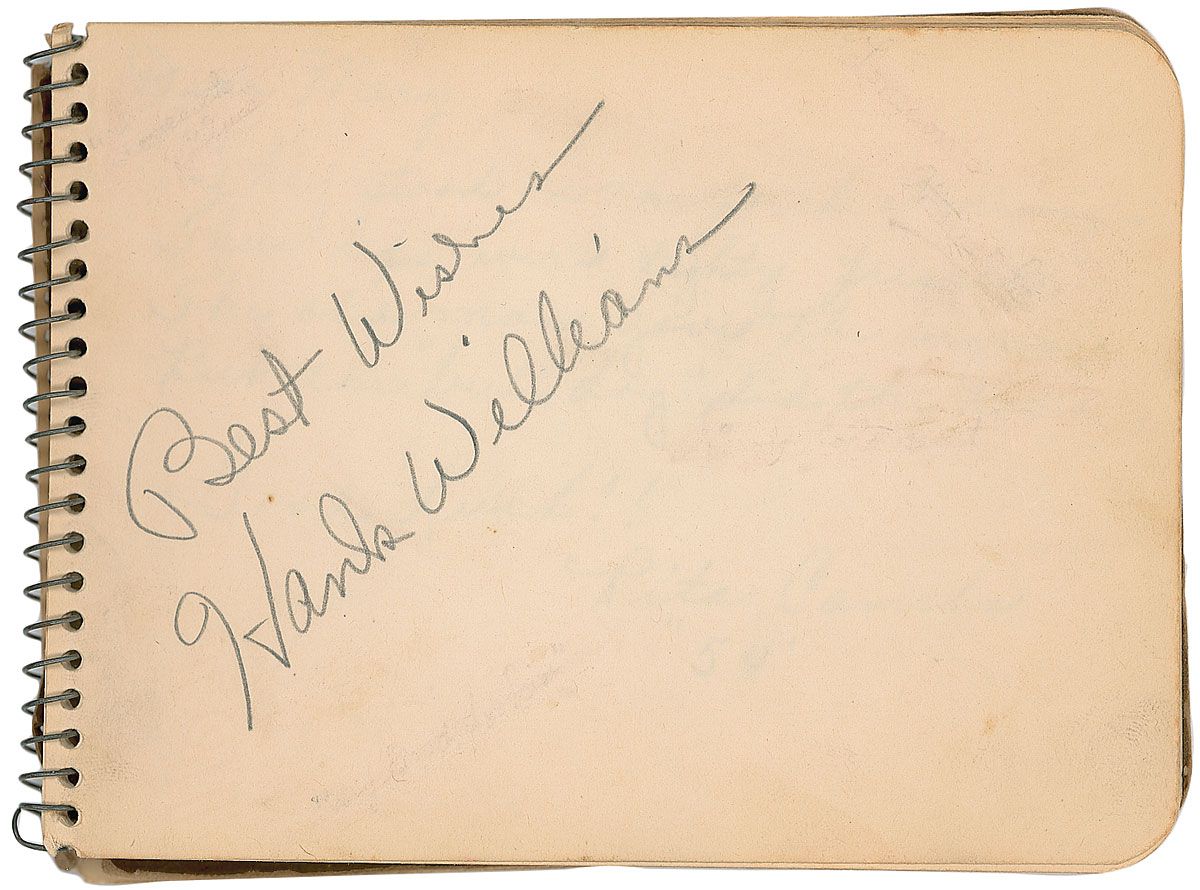 Vintage pencil signature, “Best Wishes, Hank Williams,” on an off-white 5.75 x 4.5 album page. Page is still housed in its softcover spiral-bound autograph album. In fine condition, with back cover of album detached. Accompanied by a letter of authenticity from James Spence. Also accompanied by a photocopied letter of provenance from the original recipient, who spent time with Williams in a diner after a show in Columbus, Ohio.
