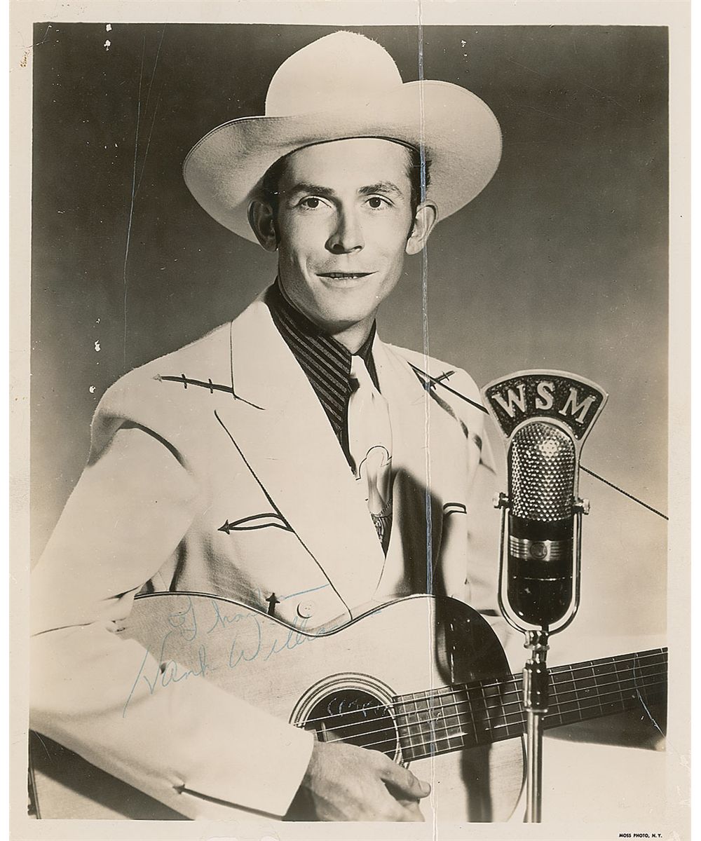 Glossy 8 x 10 photo of Williams wearing a classic cowboy hat and holding his guitar behind a WSM microphone, signed in blue ballpoint, “Thanks, Hank Williams.” In very good condition, with overall creases, a significant vertical fold passing to the right of his face, a small tear to the left edge, and the signature a few shades light.