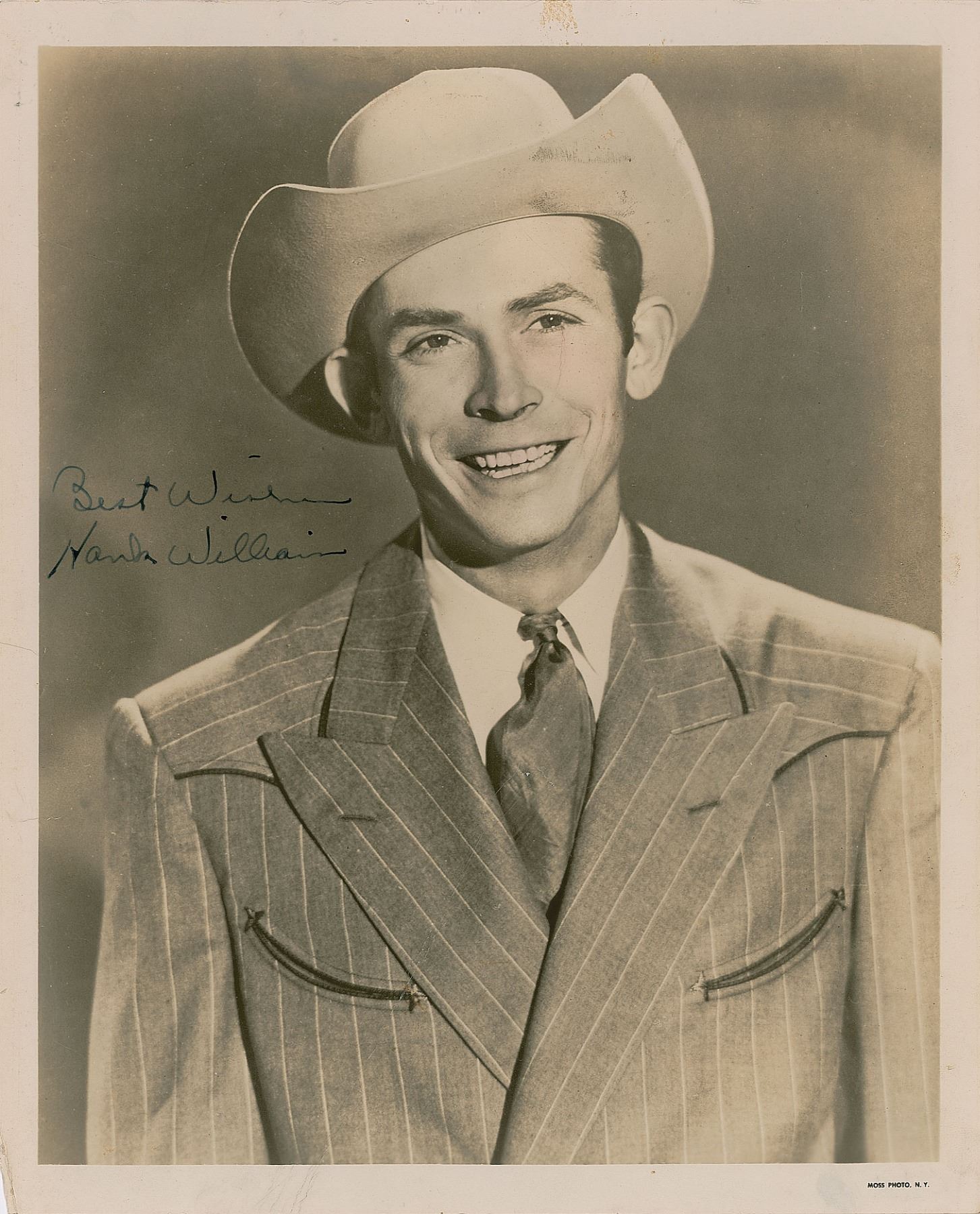 Vintage glossy 8 x 10 photo of the country music icon wearing a cowboy hat with suit and tie, signed in fountain pen, "Best wishes, Hank Williams." In very good condition, with scattered light creasing, a heavier crease passing through his tie, and surface impressions from notations on the reverse.