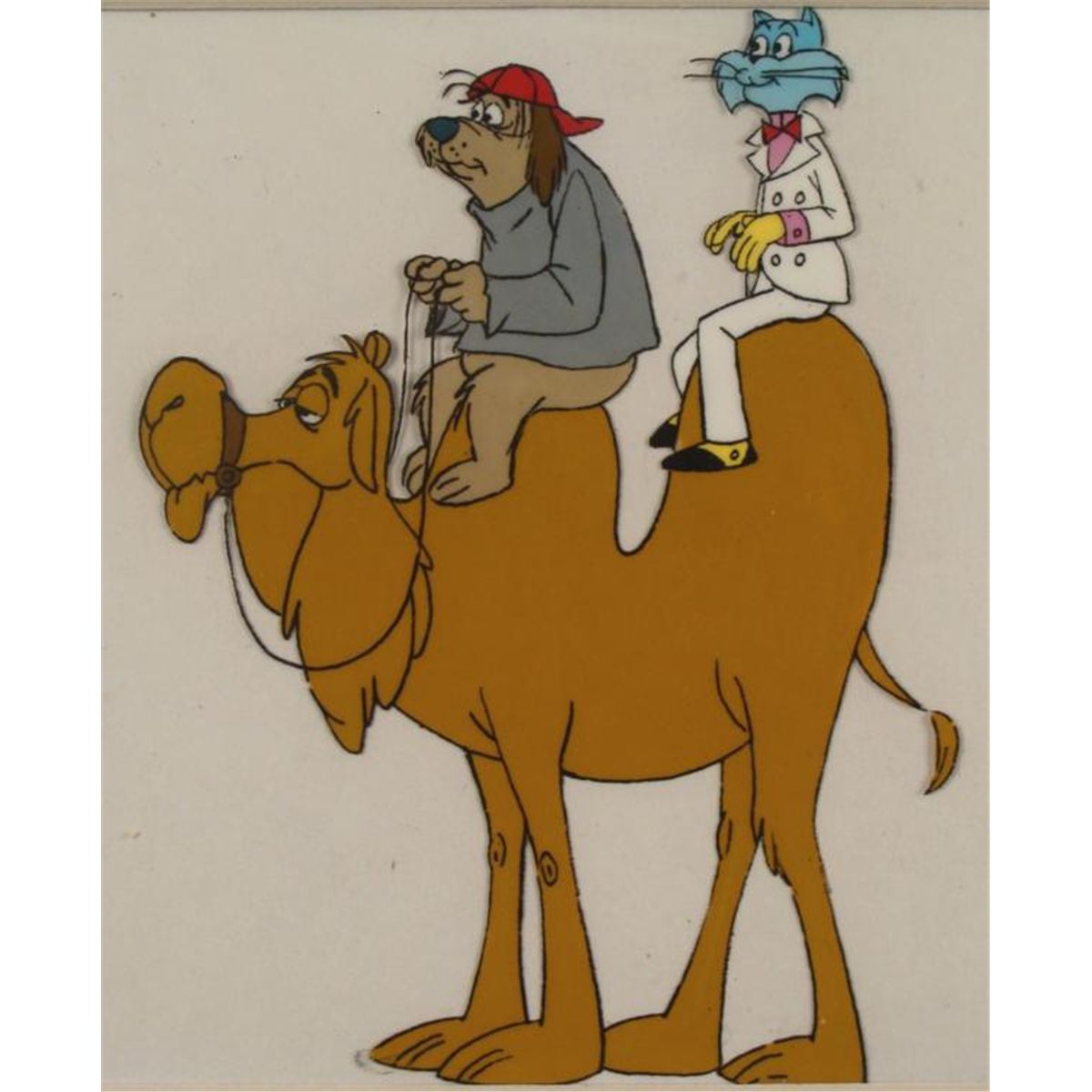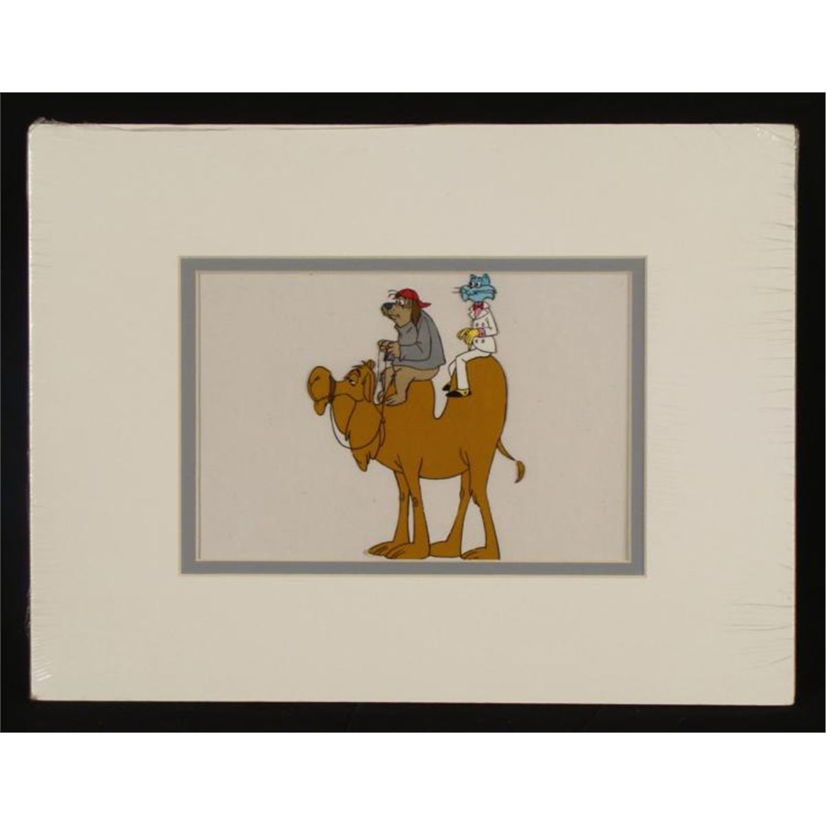 This is an original animation cel used in the production of a Hanna Barbera cartoon. Shown here is a sloppy looking dog and a rather snazzy looking cat in a white suit, both riding a camel. We're not sure which cartoon this is from. It looks like Hong Kong Phooey in his janitor outfit, but its slightly different. * Whatever it is, it will make a great find for an animation enthusiast! * Medium: Hand-inked and hand-painted acetate celImage size: 9 x 6 inches Presentation: Double matted in gray and white * Matte size: 16 x 12 inchesCondition: Excellent; sealed in cellophane