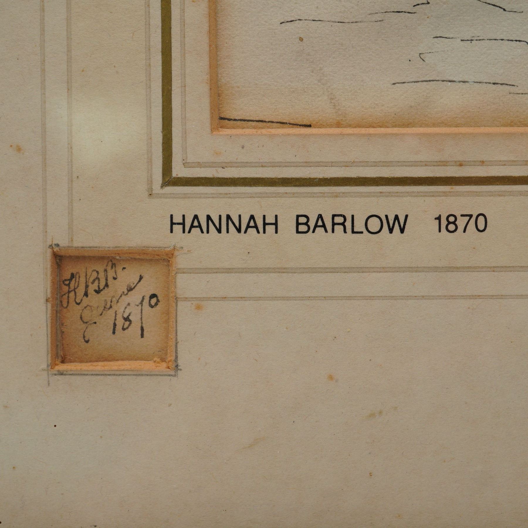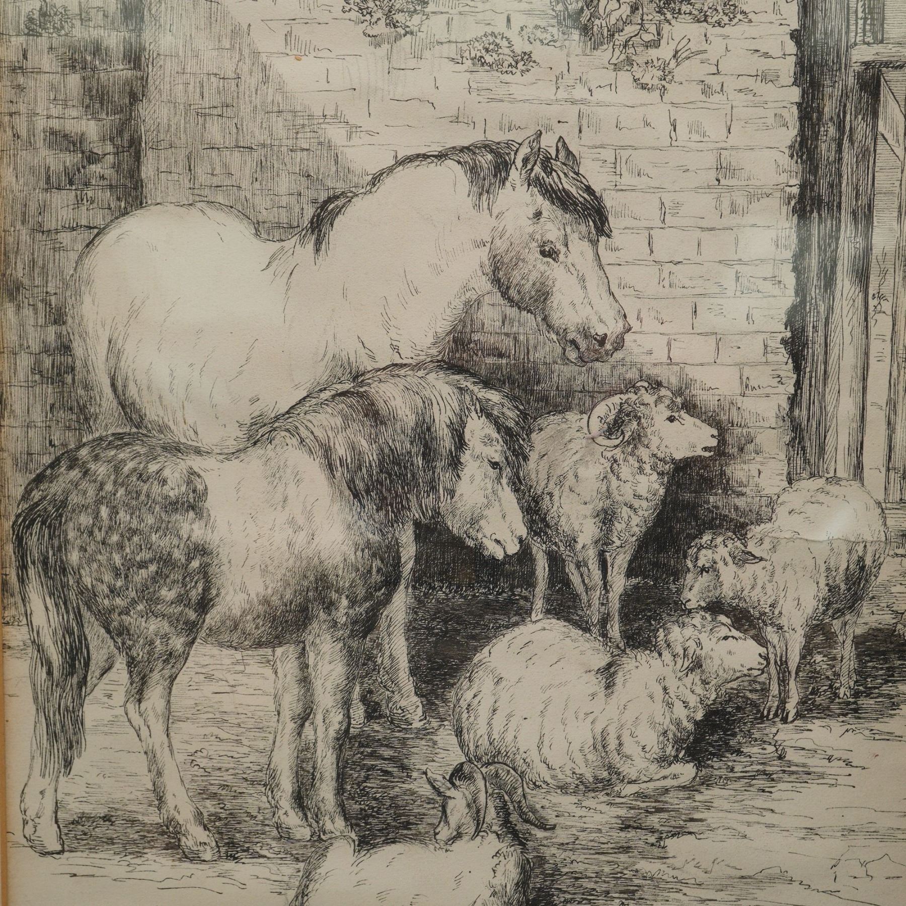 A delightful piece of original drawing depicting ponies and sheep gathered within a farm enclosure against a brick wall and timber gate. Framed behind glass with a fitted titled mount. Signed and dated by the artist to the lower left size. "Hannah Barlow 1870" to the lower right size. "In the Pond" to the lower right side.