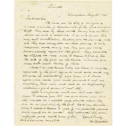 <B>Hannibal Hamlin Autograph Letter Signed as Vice President,</B></I> "<I>H. Hamlin</B></I>", one page, 7.5" x 9.75", Hamden, Maine, August 25, 1861, to Secretary of War Simon Cameron. In part: "<I>We have in the city of Bangor a small number of Secessionists of the most virulent Sort. They are by their words doing all in their power in aid of rebellion. I do not know that any act constituting treason can be proved, but yet they are doing all in their power to aid rebellion, and sway all they can in our community against the Govt. They should be stopped at once…my purpose in addressing you now, is to know upon what data, you will proceed to act in arresting these men and aid us in suppressing rebellion - for it comes to just that…</B></I>" Affixed at one margin inside a custom folder, with a 19th century engraving of Hamlin. The letter is on crisp, clean stock and grades very fine. Excellent content letter, written at a time when the country's future was in great peril. <I>Ex. Henry E. Luhrs Collection.</B></I><BR><BR><b>Shipping:</b> Flat Material, Small (<a target="_blank" href="http://www.heritageauctions.com/common/shipping.php">view shipping information</a>)