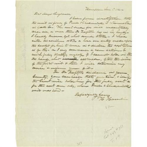 <B>Hannibal Hamlin Autograph Letter Signed</B></I> "<I>H. Hamlin</B></I>", one page, 7.75" x 9.75", Hampden, Jan. 8, 1841.Addressed to "<B>ros Hayes * Cogsmall</B></I>" regarding a legal suit filed. Excellent condition save a slightly irregular left margin where the integral sheet has been removed. <I>From the collection of Henry E. Luhrs.</B></I><BR><BR><b>Shipping:</b> Miscellaneous Collectibles, Smal (<a target="_blank" href="http://www.heritageauctions.com/common/shipping.php">view shipping information</a>)