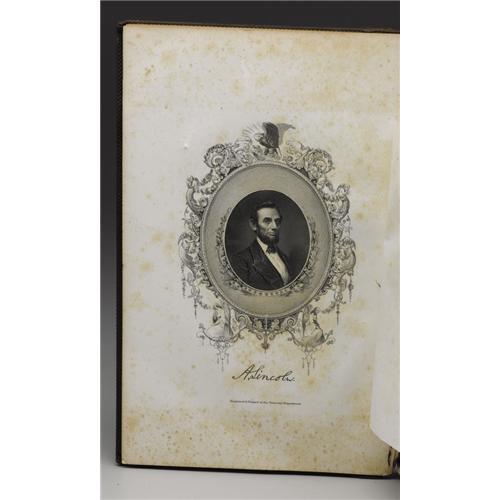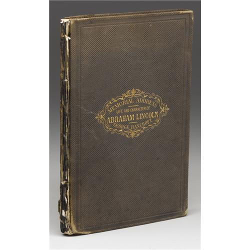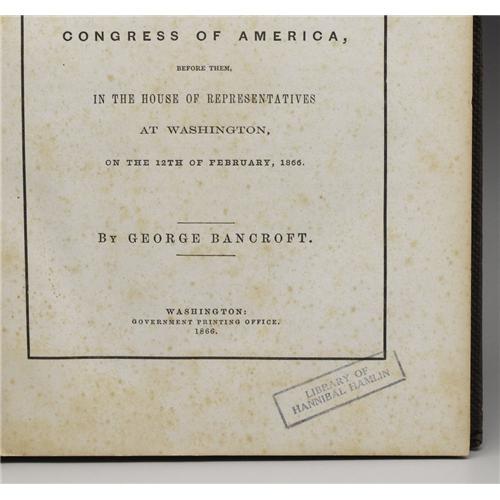 <B>Hannibal Hamlin, Lincoln's First Vice President, His Personal Copy of a George Bancroft Speech on Lincoln.</B></I> Hamlin owned this bound copy of a speech given before both houses of congress on February 12, 1866. Bancroft was a noted historian and previously served as Secretary of the Navy and founded the United States Naval Academy during his tenure. Congress chose Bancroft to give the special eulogy of Lincoln. <BR><BR>The 69-page document titled <I>Memorial Address on the Life and Character of Abraham Lincoln</B></I> is bound in a 6" x 9" brown leather volume with the notation and stamp of Hannibal Hamlin's personal library. With some tears at the binding, the frontispiece of the book displays a nice engraving of Lincoln. There is moderate foxing on most pages.<BR><BR><b>Shipping:</b> Books & Catalogs (<a target="_blank" href="http://www.heritageauctions.com/common/shipping.php">view shipping information</a>)