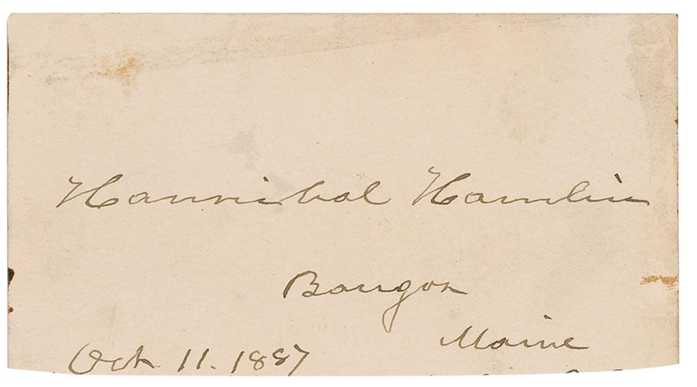 American politician (1809–1891) who served as Lincoln’s first vice president. Ink signature, “Hannibal Hamlin, Bangor, Maine, October 11, 1887,” on an off-white 3.75 x 2 card. In very good condition, with trimmed bottom edge, mild toning, and light surface loss and soiling to two edges.