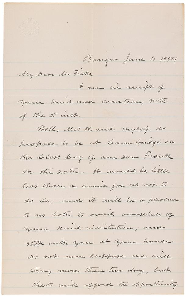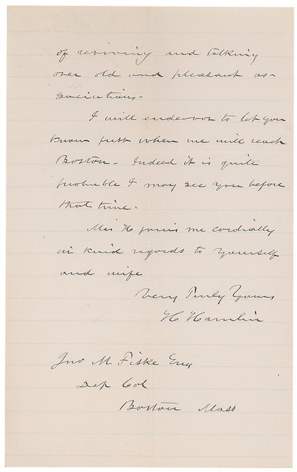 American politician (1809–1891) who served as Lincoln’s first vice president. ALS signed “H. Hamlin,” two pages, lightly-lined, 5 x 8, June 6, 1884. Hamlin accepts an invitation from Jonathan M. Fiske of Boston. In part: “Well, Mrs. H. and myself do propose to be at Cambridge on the Class Day of our son Frank on the 20th. It would be little less than a crime for us not to do so, and it will be a pleasure to us both to avail ourselves of your kind invitation, and stop with you at your house. Do not now suppose we will tarry more than two days, but that will afford the opportunity of reviving and talking over the old and pleasant associations. I will endeavor to let you know just when we will reach Boston. Indeed it is quite probably I may see you before that time.” In fine condition, with central horizontal and vertical folds and light toning.