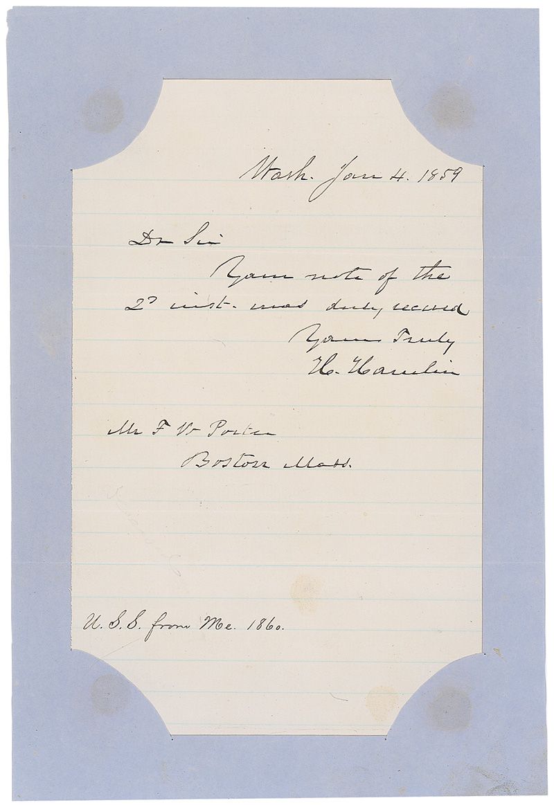 ALS signed “H. Hamlin,” one page, lightly-lined, 5 x 8, June 4, 1859. Letter to a gentleman from Boston. In full: “Your note of the 2d inst. duly received.” Affixed by corners to another sheet to an overall size of 6.5 x 9.5. Two light stains and an erased pencil notation to the bottom, and show-through from glue in corners, otherwise fine condition.