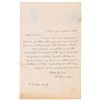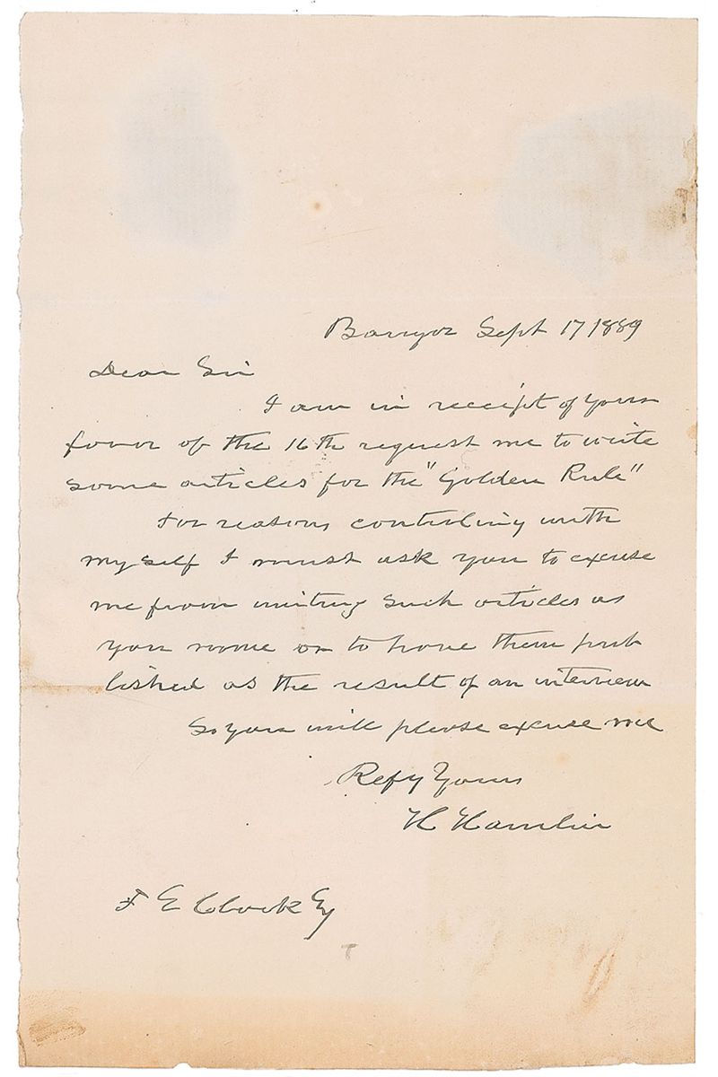 ALS signed “H. Hamlin,” one page, 5.25 x 8.25, September 17, 1889. Letter to Francis Edward Clark. In part: “I am in receipt of your favor of the 16th request me to write some articles for the ‘Golden Rule’…I must ask you to excuse me from writing such articles as you name or to have them published as the result of an interview.” Scattered toning and soiling, and slight show-through from mounting remnants to reverse, otherwise fine condition.