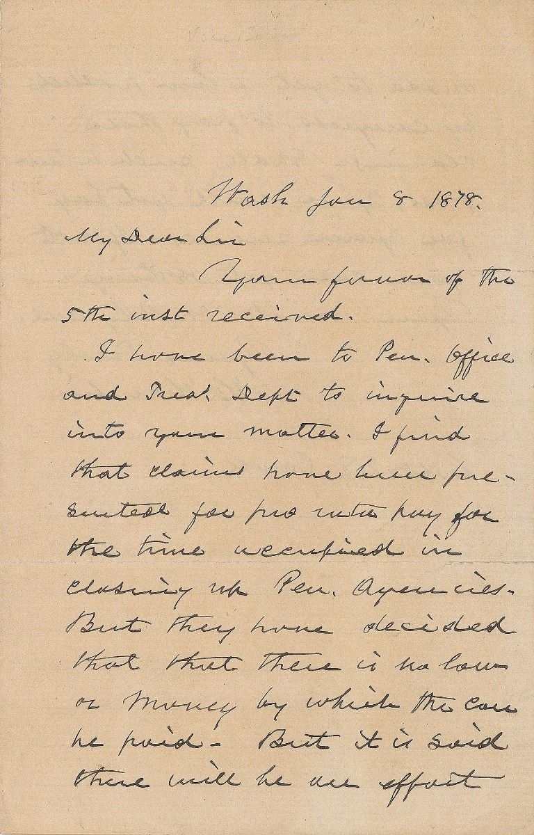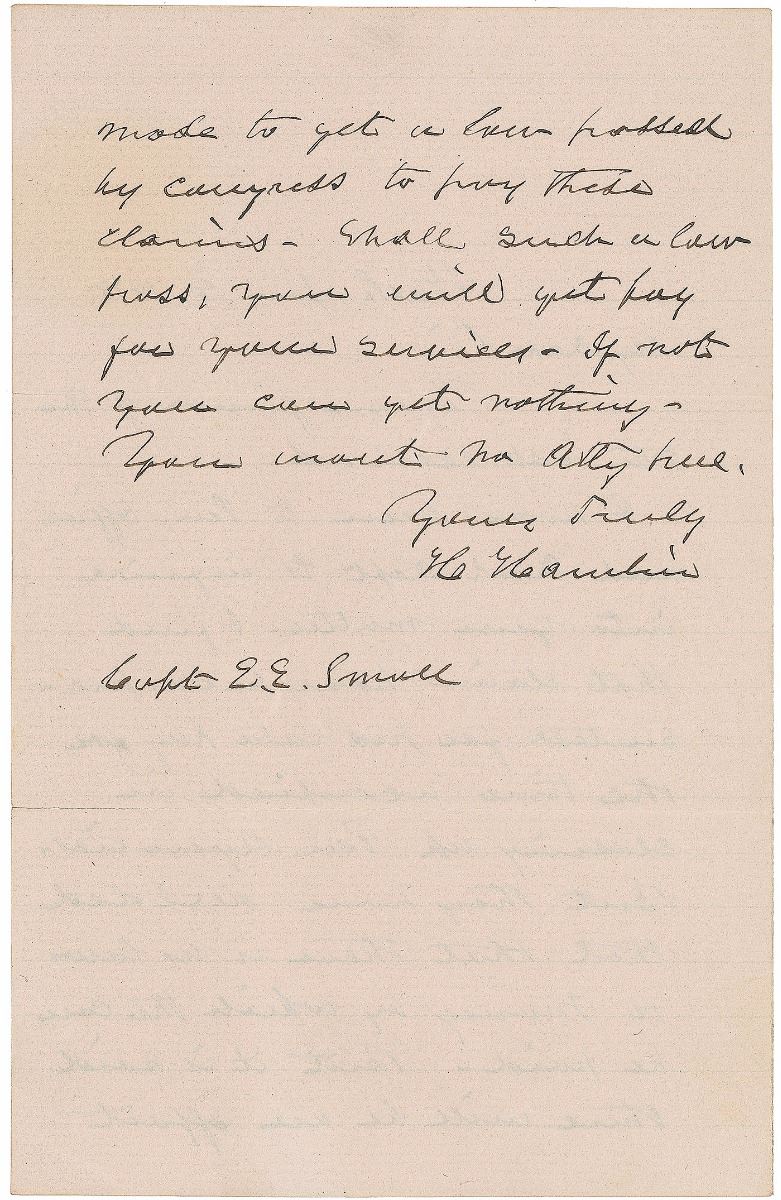 ALS signed “H. Hamlin,” one page both sides, 4.5 x 7, January 8, 1878. Letter to E. E. Small, in part: “I have been to Pen. Office and Treas. Dept to inquire into your matter. I find that claims have been presented…for the time occupied in closing up Pen. Agencies. But they have decided that there is no law or money by which the law can be paid. But is said there will be an effort made to get a law passed by Congress to pay these claims.” In fine condition, with partial separations to folds.