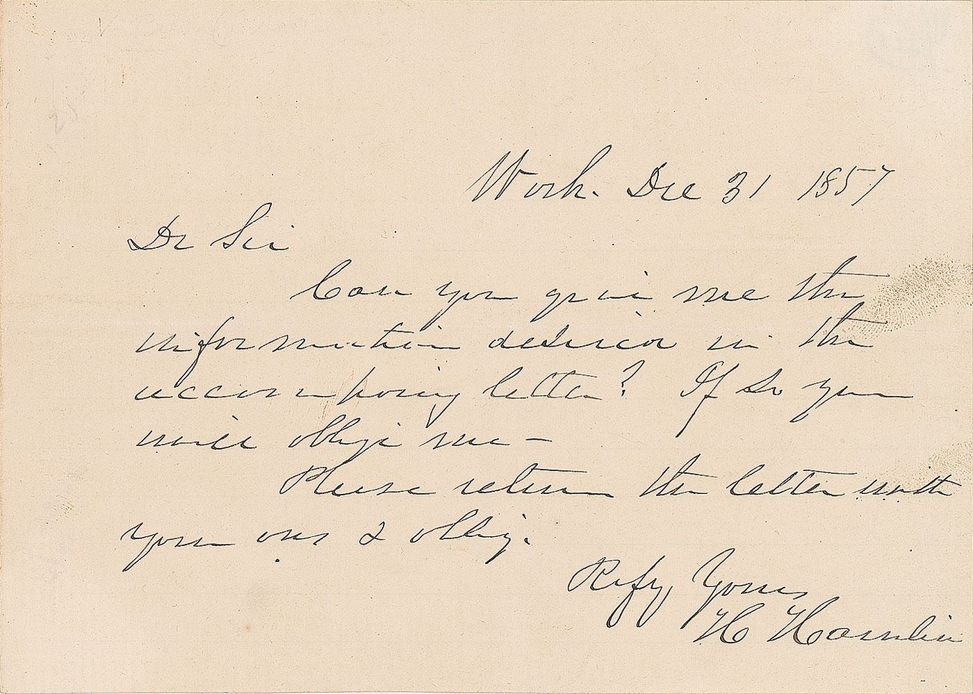 ALS signed “H. Hamlin,” one page, 6.25 x 4.5, December 31, 1857. Letter to a gentleman, in part: "Can you give me the information desired in the accompanying letter? If so you will oblige me." In fine condition.