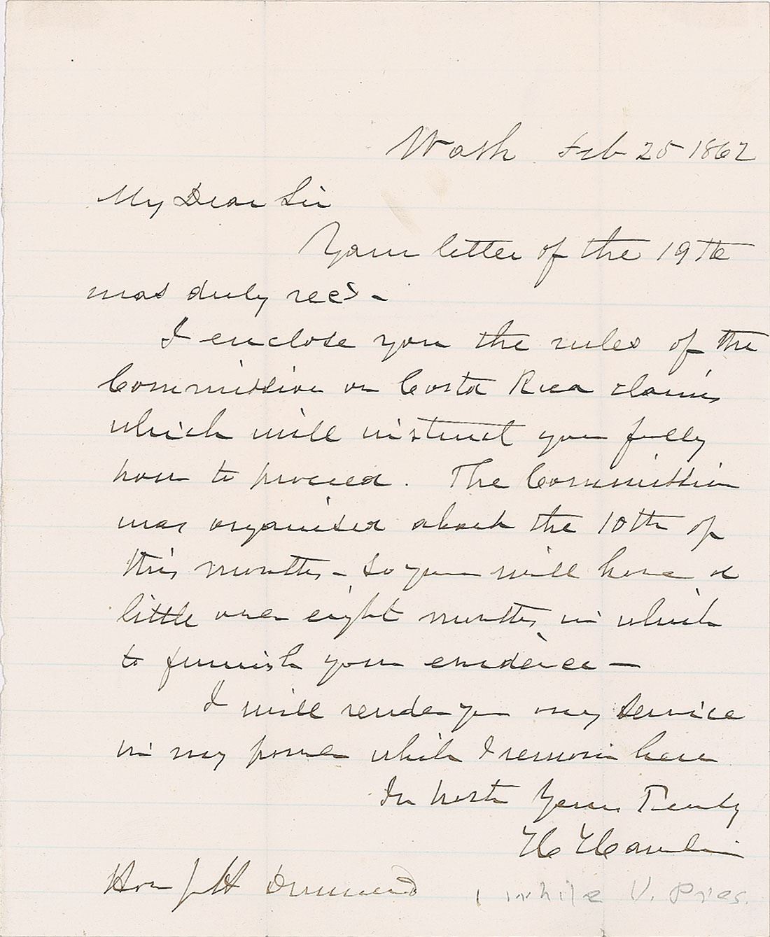 Civil War-dated ALS as vice president signed “H. Hamlin,” one page, 6.5 x 8, February 25, 1862. In full: "Your letter of the 19th was duly rec'd. I enclose you the rules of the Commission on Costa Rica claims which will instruct you fully how to proceed. The Commission was organized about the 10th of this month, so you will have a little over eight months in which to furnish your evidence. I will render you every service in my power while I remain here." In fine condition. Accompanied by an engraving bearing a preprinted signature.