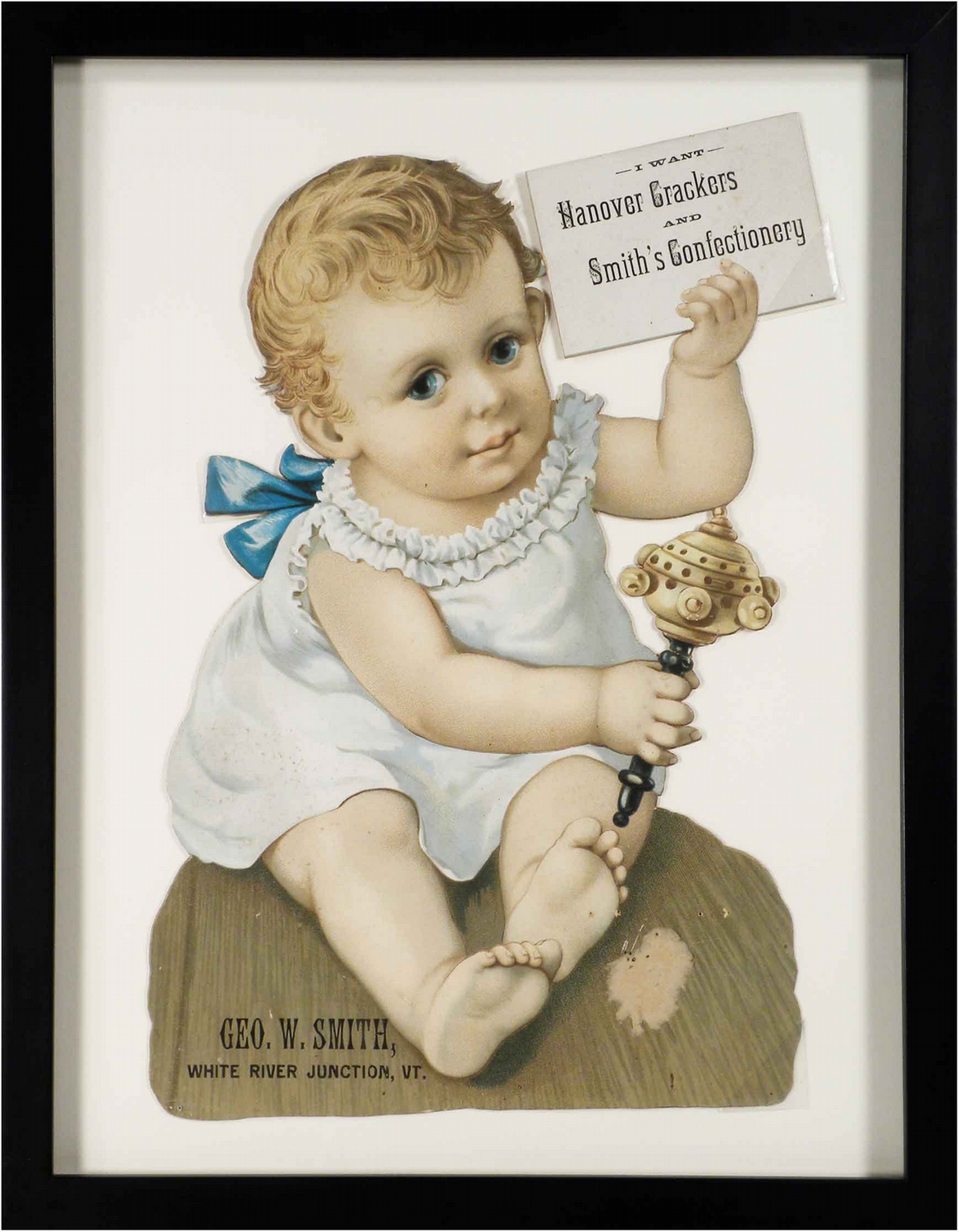 Hanover Crackers and Smith's Confections Embossed Die Cut Sign. Geo. W. Smith White River Junction, VT. Framed under glass. 1 1/2 inch rub and pin holes in bottom right corner otherwise very good condition. 10 X 13 1/2 inches image only.