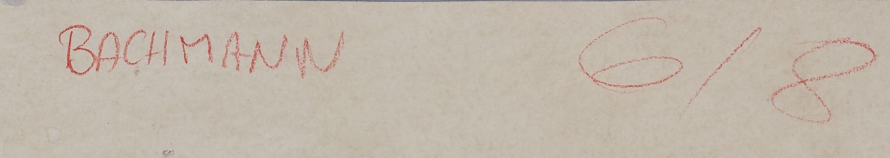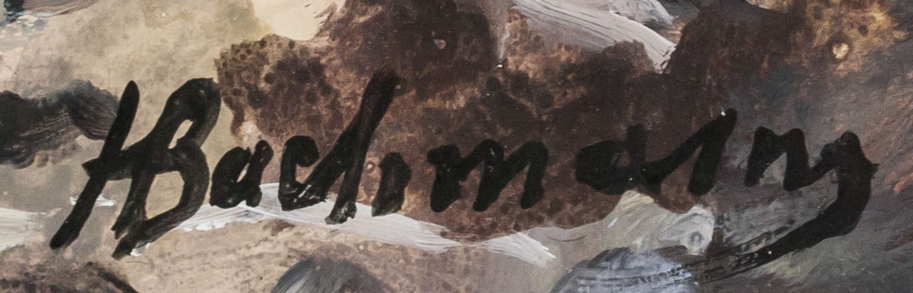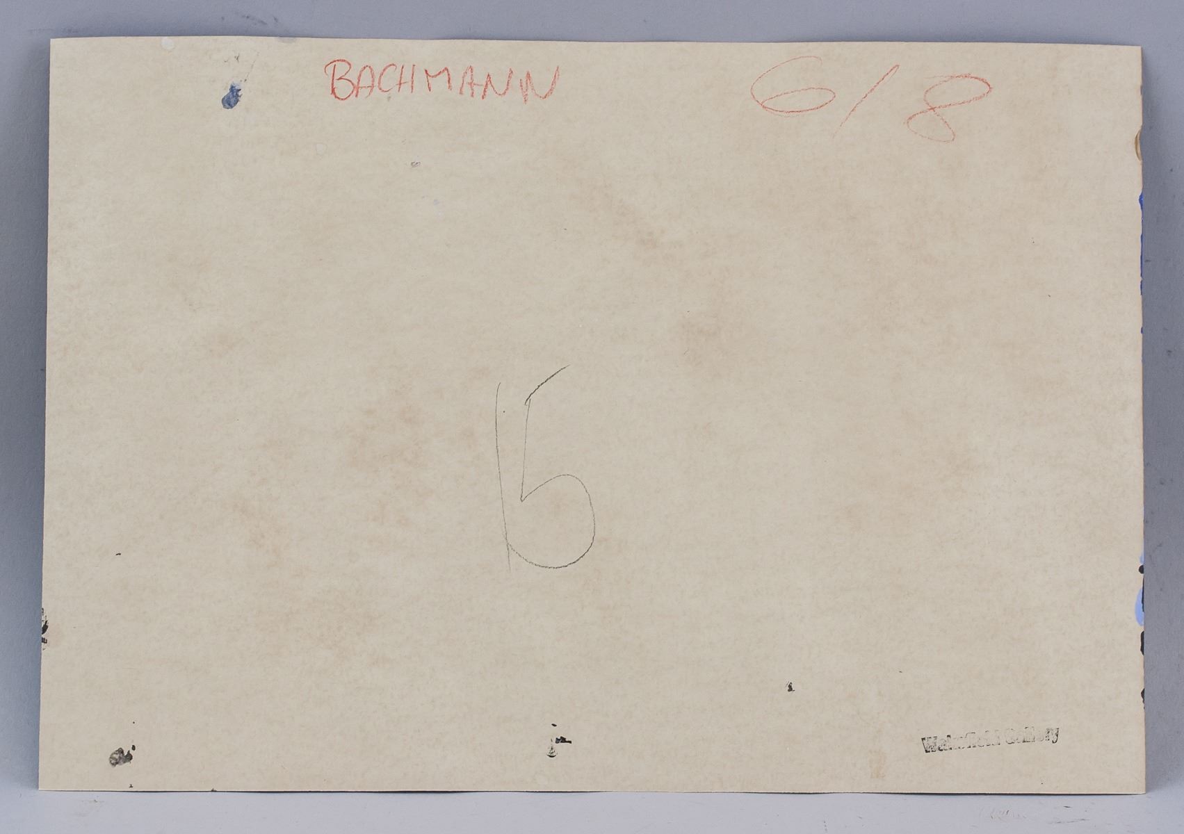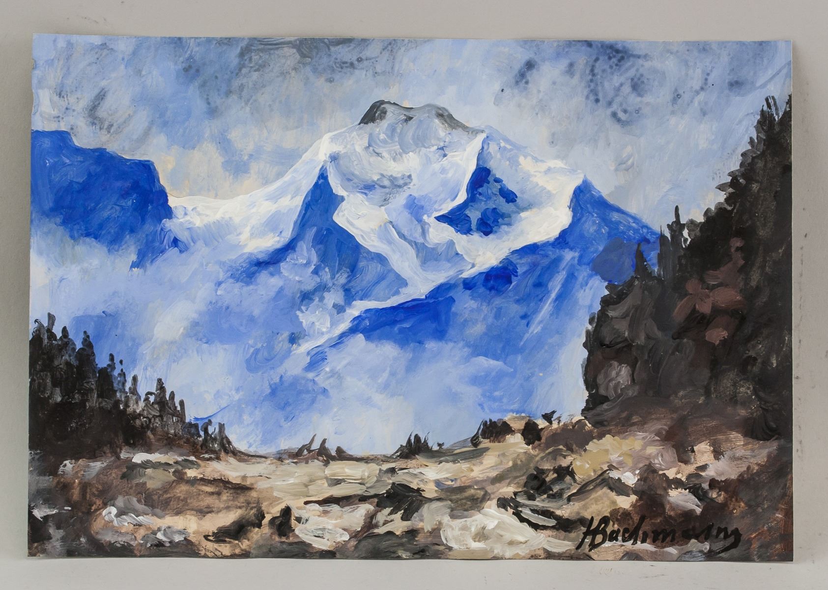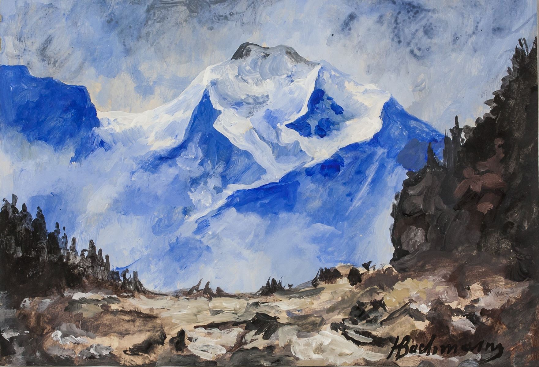 Tempera on paper. Featuring a landscape sccene of mountains and tree-lined valley. Signed HBachmann on the lower right corner. Inscribed BACHMANN and 6/8 on verso. Inscribed in pencil 15 in the middle of verso. Stamped Wakefield Gallery on verso. Attributed to Hans Bachmann (1852-1917, Swiss). 20 x 29 cm (7.9 x 11.4 inches). PROVENANCE: Southern Ontario estate