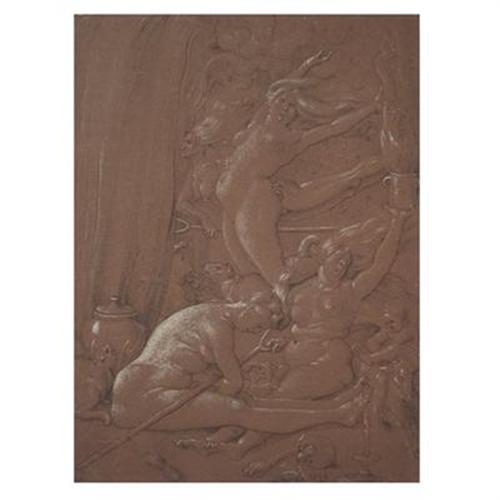 Notes:Drawings by German Masters of the XV-XVIII Centuries. From a selection of 21 facsimiles of the originals preserved in the Albertina Collection in Vienna. With an introduction and descriptive text by Campbell Dodgson, M.A, C.B.E. Edited in English by Dodgson, keeper of prints and drawings at the British Museum. Published in London by BT Batsford Ltd, 94, High Holborn in 1930. The edition for the British Empire and the United States of America is limited to 125 copies. All rights of this work are the property of Anton Schroll & Co who are publishers of the German Edition. Printed in Austria. Plate #4 "Witches Preparing for Their Sabbath": Three young witches sit on the ground beside a boiling cauldron; near them are cats and a he-goat on whose back a child is climbing. An old witch and a young one who presses one of the cats between her knees are just starting to fly. The original was drawn in pen in Indian ink on a brown ground and heightened with white. Dated 1514; of the monogram beneath the date part only is preserved.